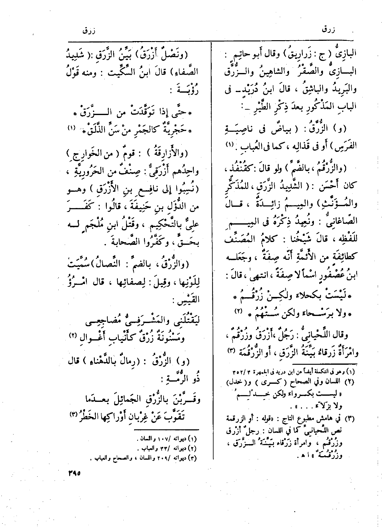 والزُّرْقُمُ، بالضمِّ وَلَو قالَ: كقُنْفُذٍ، كَانَ أحْسَن: الشَّدِيدُ الزَّرَقِ، للمُذَكرِ والمُؤَنَّثِ والمِيمُ زائِدَةٌ، قالَ الصّاغانِيُّ: ونُعِيدُ ذِكْرَهُ فِي المِيم للَفْظِه، قالَ شَيْخُنا: كلامُ المُصَنِّف كطائِفَةٍ من الأَئمَّةِ أَنّه صِفَة، وجَعَله ابنُ عُصْفُورٍ اسْماً لَا صِفَةٌ، انْتهى، قالَ: لَيْسَتْ بكحلاءَ ولكِنْ زُرْقُمُ وَلَا برَسْحاءَ وَلَكِن سُتْهُمُ وَقَالَ اللِّحْيانيُّ: رَجُلٌ، أزْرَقُ وزُرْقُمٌ، وامْرَأَةٌ زَرقاءُ بَيِّنَةُ الزَّرَقِ، أَو الزُّرْقُمَة ونَصْلٌ أَزْرَقُ بَيِّنُ الزَّرَقِ: شَدِيدُ الصَّفاءَ قالَ ابنُ السِّكِّيت: وَمِنْه قَوْلُ رُؤْبَةَ: حتَّى إِذا تَوَقَّدَتْ من الزَّرَقْ حَجْرِيَّةٌ كالجَمْرِ منْ سَنِّ الذَّلَقْ والأَزارِقَةُ: قومٌ من الخَوارِجِ واحِدُهم أَزْرَقِيٌّ: صِنْفٌ من الحَرُورِيةِ، نُسِبُوا إِلى نافِعٍ بنِ الأَزْرَقِ وَهُوَ من الدُّؤَلِ بنِ حَنِيفةَ، قالُوا: كَفَرَ علِيٌ بالتَّحْكِيم، وقَتْلُ ابنِ مُلْجَم لَهُ بحَقٍّ، وكَفَّرُوا الصَّحابةَ. والزُّرقُ، بالضمِّ: النِّصالُ سُمِّيَتْ لِلَوْنِها، وقِيلَ: لِصفائِها، قَالَ امْرُؤُ القَيْسِ: