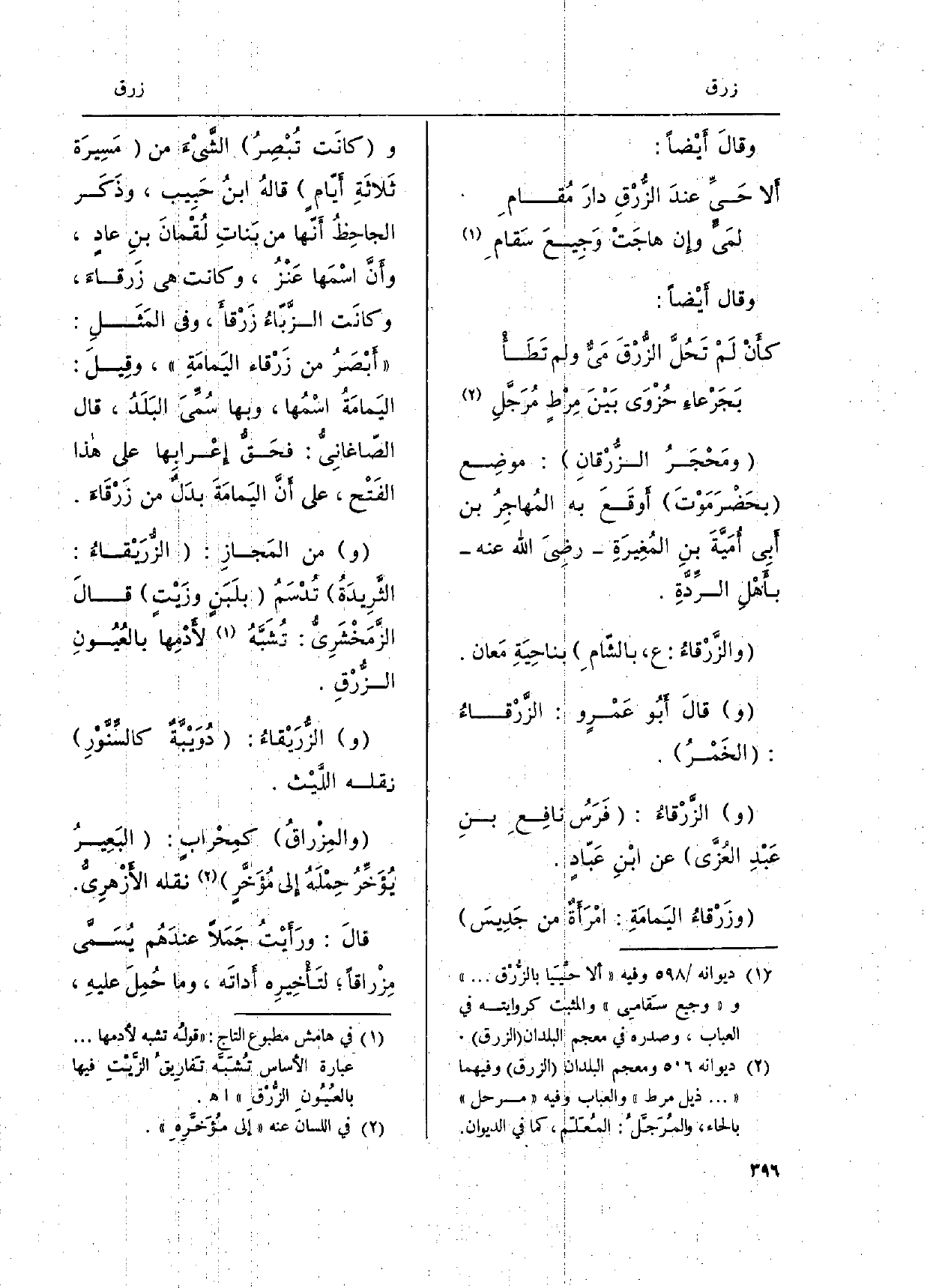 والزَّرْقاءُ: ع، بالشّام بناحِيَةِ مَعان. وقالَ أَبُو عَمْرٍ و: الزرْقاءُ: الخَمْرُ. والزَّرْقاءُ: فَرَسُ نافِع عَبْدِ العُزَّى عَن ابْنِ عَبّادٍ. وزَرْقاءُ اليَمامَةِ: امْرَأة من جَدِيسَ وكانَت تُبْصِرُ الشَّيْءَ من مَسِيرَة ثَلاثَةِ أَيّام قالهُ ابنُ حَبِيب، وذَكَر الجاحِظُ أَنّها من بَناتِ لُقْمانَ بنِ عادٍ، وأنَّ اسْمَها عَنْزُ، وَكَانَت هِيَ زَرقاءَ، وكانَت الزَّبّاءُ زَرْقأَ، وَفِي المَثَلِ: أَبْصَرُ من زَرْقاء اليَمامَةِ، وقِيلَ: اليَمامَةُ اسْمُها، وَبهَا سُمِّيَ البَلَدُ، قَالَ الصّاغانِيُّ: فحَقَّ إِعْرابِها على هَذَا الفَتْح، على أَنَّ اليَمامَةَ بدَلٌ من زَرْقَاءَ.