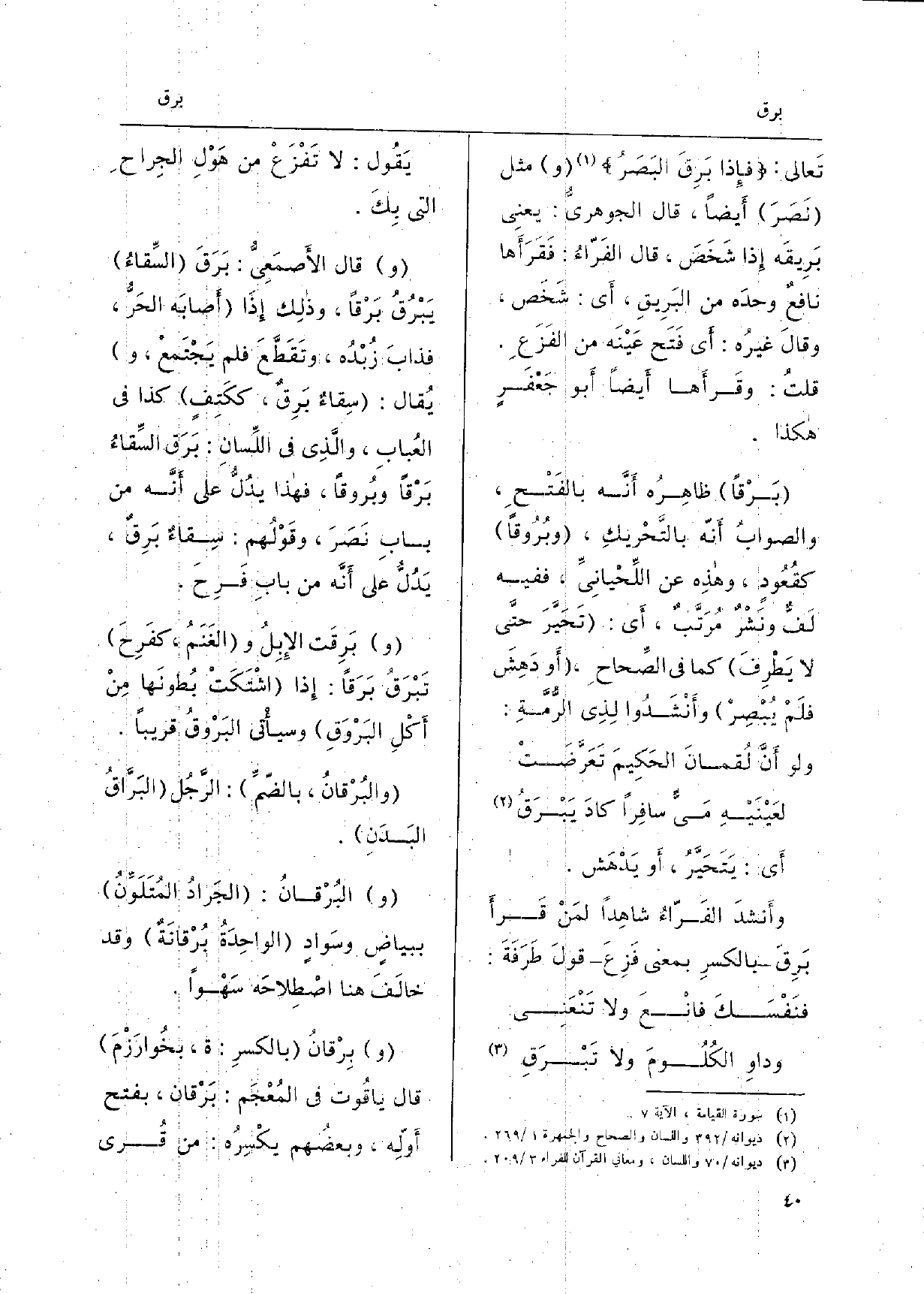 تَعَالَى: فَإِذا بَرق البَصَر وَمثل نصر أَيْضا، قَالَ الْجَوْهَرِي: يَعْنِي بريقه إِذا شخص قَالَ الْفراء: فقرأها نَافِع وَحده من البريق أَي: شخص وَقَالَ غَيره: أَي فتح عينه من الْفَزع قلت: وَقرأَهَا أَيْضا أَبُو جَعْفَر هَكَذَا.