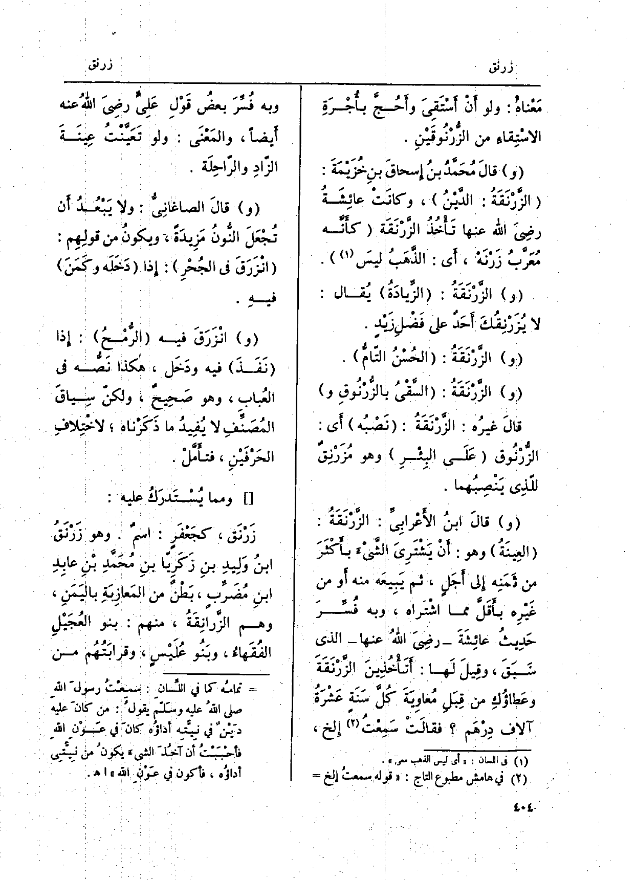 وقالَ ابنُ الأَعْرابِيَ: الزَّرنَقَةُ: العِينَةُ وَهُوَ: أَنْ يَشَترِيَ الشّيْءَ بأَكْثرَ من ثَمَنِه إِلَى أَجَلٍ، ثمَّ يَبِيعَه مِنْهُ أَو من غَيْرِه بأقَل مِمَّا اشْتراه، وَبِه فُسِّرَ حَديثُ عائِشَةَ رضِيَ اللهُ عَنْهَا الَّذِي سَبَقَ، وقِيلَ لَها: أَتَاخذِينَ الزَّرنَقَةَ وعَطاؤُكِ من قِبَلِ مُعاوِيَةَ كلَّ سَنَة عَشرةُ آلَاف دِرْهَم فقالَتْ سمَعتُِإلخ، وَبِه فسِّرَ بعضُ قَوْلِ عَلِي رضِيَ الله عَنهُ أَيْضا، والمَعْنَى: وَلَو تَعَيَّنْتُ عِينَةَ الزَّادِ والرّاحِلَة.