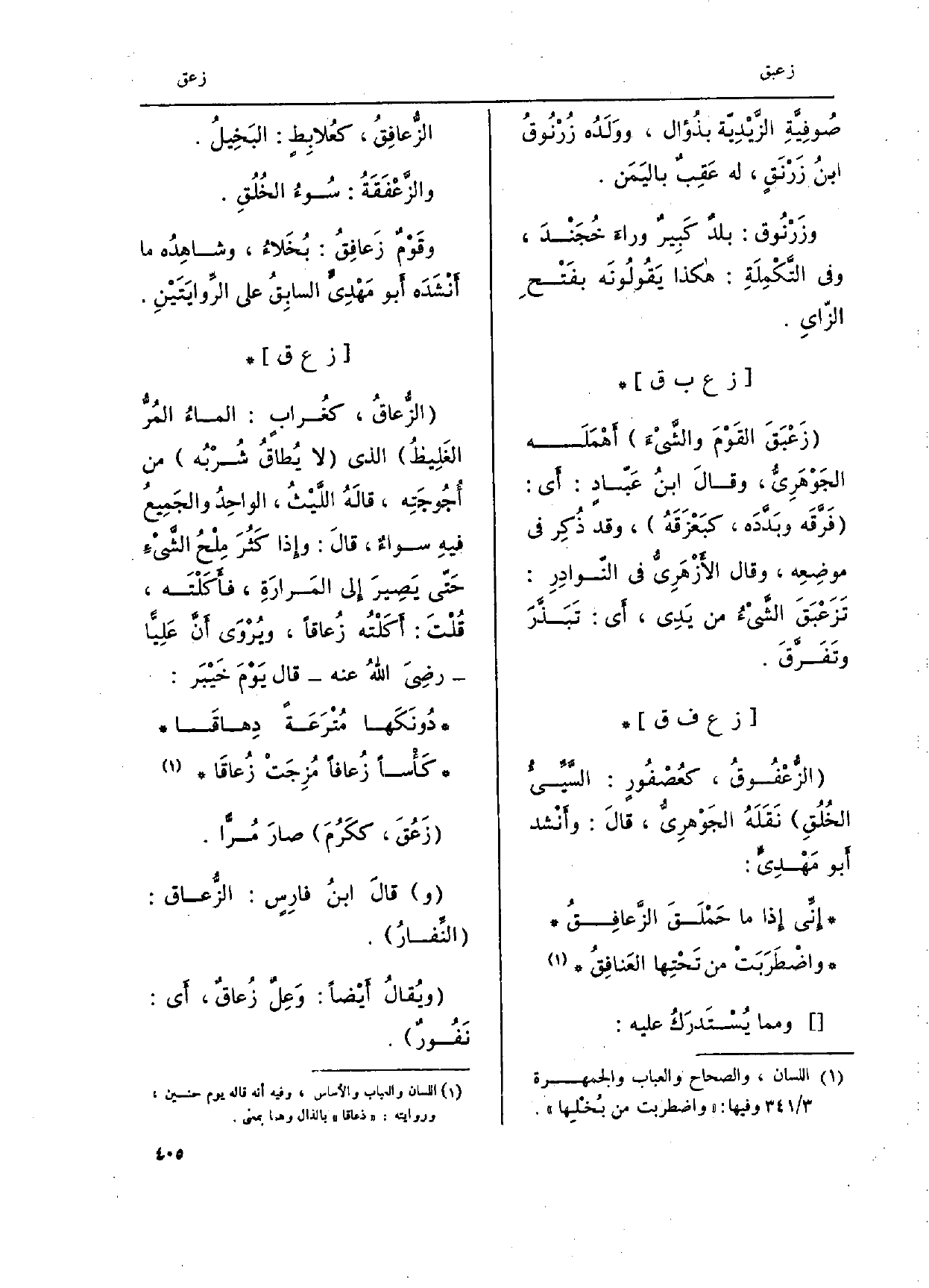 الزُّعفُوق، كعُصفُورٍ: السَّيَيءُ الخُلُقِ نَقَلَهُ الجَوْهرِيُّ، قالَ: وأَنْشد أَبُو مَهْدِيٍّ. إِنِّي إِذا مَا حَمْلَقَ الزَّعافِقُ واضْطَرَبَتْ من تَحْتِها العَنافِقُ وَمِمَّا يُستَدرَكُ عَلَيْهِ: الزَّعافِقُ، كعُلابِط: البَخِيلُ. والزعْفَقَةُ: سُوءُ الخُلُقِ. وقَوْمٌ زَعافِقُ: بُخلاءُ، وشاهِدُه مأ أَنشَدَه أَبو مَهدِيٍّ السابِقُ على الرِّوايَتَينِ.