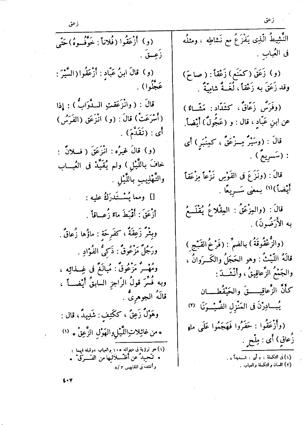 وأَزْعَقُوا: حَفَرُوا فَهَجَمُوا على ماءٍ زُعاقٍ أَي: ملْحٍ. أَزْعَقُوا فُلاناً: خَوفوهُ حَتّى زَعِقَ. قالَ ابنُ عَبادٍ: أزْعَقُوا السَّيرَ: عَجلُوا. قالَ: وانْزَعَقتِ الدَّوَابُّ: إِذا أَسْرَعت قالَ: وانْزَعَق الفَرس أَي: تقَّدَّمَ. قالَ غيرُه: انْزَعَقَ فلَان: خافَ باللَّيْلِ وَلم يُقَيَّدْ فِي العُباب والتَّهْذِيبِ باللَّيْلِ. وَمِمَّا يستَدرَكُ عَلَيْهِ: أزْعَقَ: أَنبَطَ مَاء زُعاقاً. وبئْرٌ زَعِقَةٌ، كفَرِحَةٍ: ماؤُها زعاق. ورجُلٌ مزْعُوقٌ: ذكي الفُؤادِ.