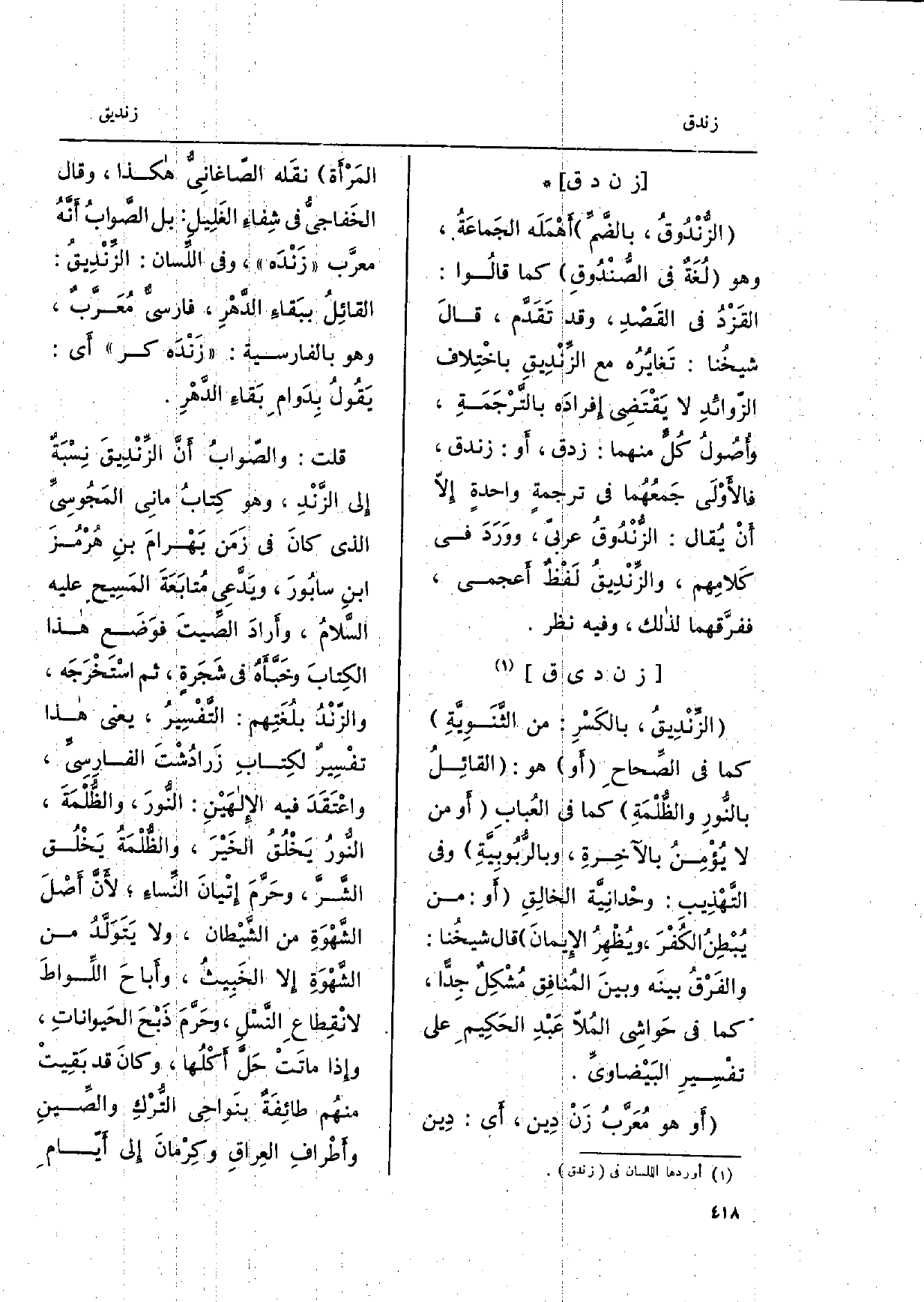 قلت: والصّوابُ أَنَّ الزِّنْدِيقَ نِسْبَة إِلى الزَّنْدِ، وَهُوَ كِتاب ماني المَجُوسِيِّ الَّذِي كانَ فِي رمَن بَهْرامَ بنِ هُرْمُزَ ابنِ سابُورَ، ويَدَّعِي مُتابَعَةَ المَسِيح عَلَيْهِ السلامُ، وأرادَ الصِّيتَ فوَضَع هَذَا الكِتابَ وخَبَّأَهُ فِي شَجَرةٍ، ثمَّ استَخْرَجَه، والزّنْدُ بلغَتِهم: التَّفْسِيرُ، يَعْنِي هَذَا تفسِير لكِتابِ زَرادُشْتَ الفارسِيِّ، واعتَقَدَ فِيهِ الإِلهَيْنِ: النورَ، والظُّلْمَةَ، النُّورُ يَخْلُقُ الخَيْرَ، والظُّلْمَةُ يَخْلُق الشَّر، وحَرَّمَ إِتْيانَ النِّساءَ لأَنَّ أَصْلَ الشهوَةِ من الشَّيْطان، وَلَا يَتَوَلّد من الشَّهْوَةِ إِلا الخَبِيث، وأباحَ اللِّواطَ لانْقِطاع النسْلِ، وحَرَّمَ ذَبْحَ الحَيواناتِ، وَإِذا مَاتَت حل أكلُها، وكانتَ قد بَقِيتْ: مِنْهُم طَائِفَة بنواحِي التُّركِ والصينِ وأَطْراف العراقِ وكِرْمانَ إِلى أَيّام