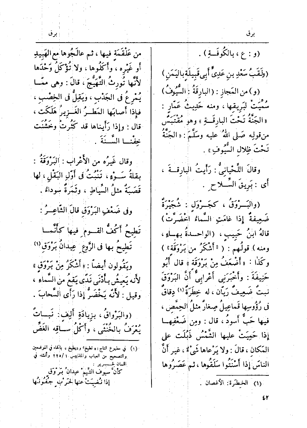 وقالَ اللِّحْيانِيُّ: رَأَيتُ البارِقةَ، أَي: بَرِيقَ السِّلَاح. والبرْوَقُ، كجَروَلٍ: شجَيْرَةٌ ضَعِيفة إِذا غامَتِ السَّماءُ اخضَرَّتْ قالهُ ابنُ حَبِيبٍ، الواحدةُ بهاءَ، وَمِنْه قولُهم: أشكَرُ من بَرْوَقَة وكَذا: أَضْعَفُ مِنْ بَرْوَقَةٍ قَالَ أبُو حَنيفَةَ: وأخْبَرَنِي أَعْرابِي أَنَّ البَرْوَقَ نبتٌ ضَعِيفٌ رَياّن، لَهُ خِطرة دِقاق فِي رُؤُوسها قَماعِيلُ صِغارٌ مثلُ الحِمَّصِ، فِيهَا حَبّ أَسودُ، قَالَ: ومِن ضَعْفِها إِذا حميَتْ عَلَيْهَا الشَّمْسُ ذَبُلَت على المَكانِ، قالَ: وَلَا يَرْعاها شَيءٌ، غير أَنَّ الناسَ إِذا أَسنتُوا سَلَقُوها، ثمَّ عَصَرُوها من علقمَةٍ فِيهَا، ثمَّ عالَجُوها مَعَ الَهبِيدِ أَو غَيْرِه، وأَكَلُوها، وَلَا تُؤْكَلُ وَحْدَها لأَنَّها تورِثُ التهَيُجِّ، قالَ: وَهِي ممّا يُمْرِعُ فِي الجَدْبِ، ويَقِلُّ فِي الخِصْب، فإِذا أَصابَها المَطرُ الغَزِيرُ هَلَكَتَ، قَالَ: وإِذا رَأَيناها قد كَثُرتْ وخَشُنَت خفْنا السَّنَةَ. وَقَالَ غَيرُه من الأَعْراب: البَرْوَقَةُ: بقلةُ سَوْءً، تَنْبُتُ فِي أَوّلِ البَقْلِ، لَهَا قَصَبَةٌ مثلُ السِّياطِ، وثَمَرةٌ سوداءُ. وَفِي ضَعْفِ البَرْوَقِ قالَ الشّاعِرُ: