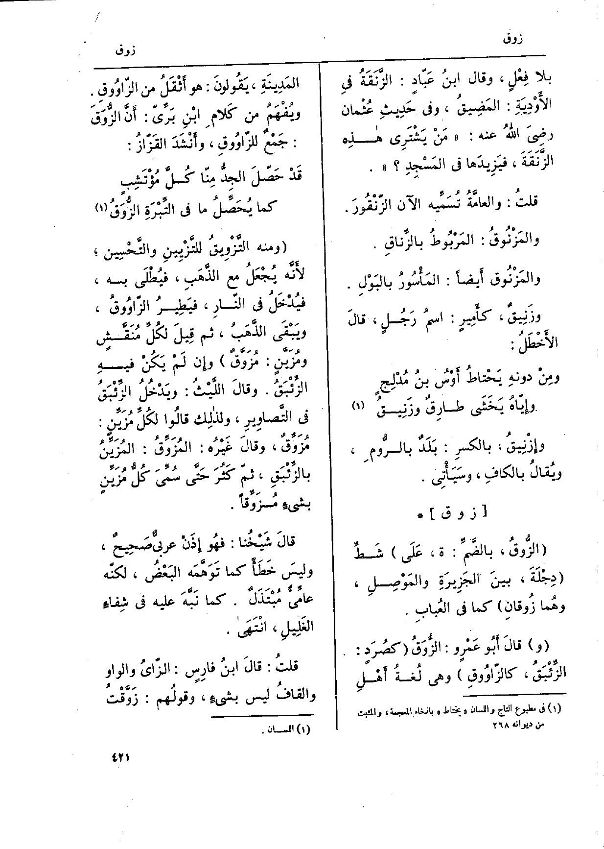 قلت: والعامَّةُ تُسَمِّيه الْآن الزّنقُورَ. والمَزْنُوقُ: المَربُوطُ بالزِّناقِ. والمَزْنُوق أَيضاً: المأسورُ بالبَوْلِ. وزَنِيقٌ، كأمِيرٍ: اسمُ رَجُلٍ، قالَ الأَخْطَلُ: