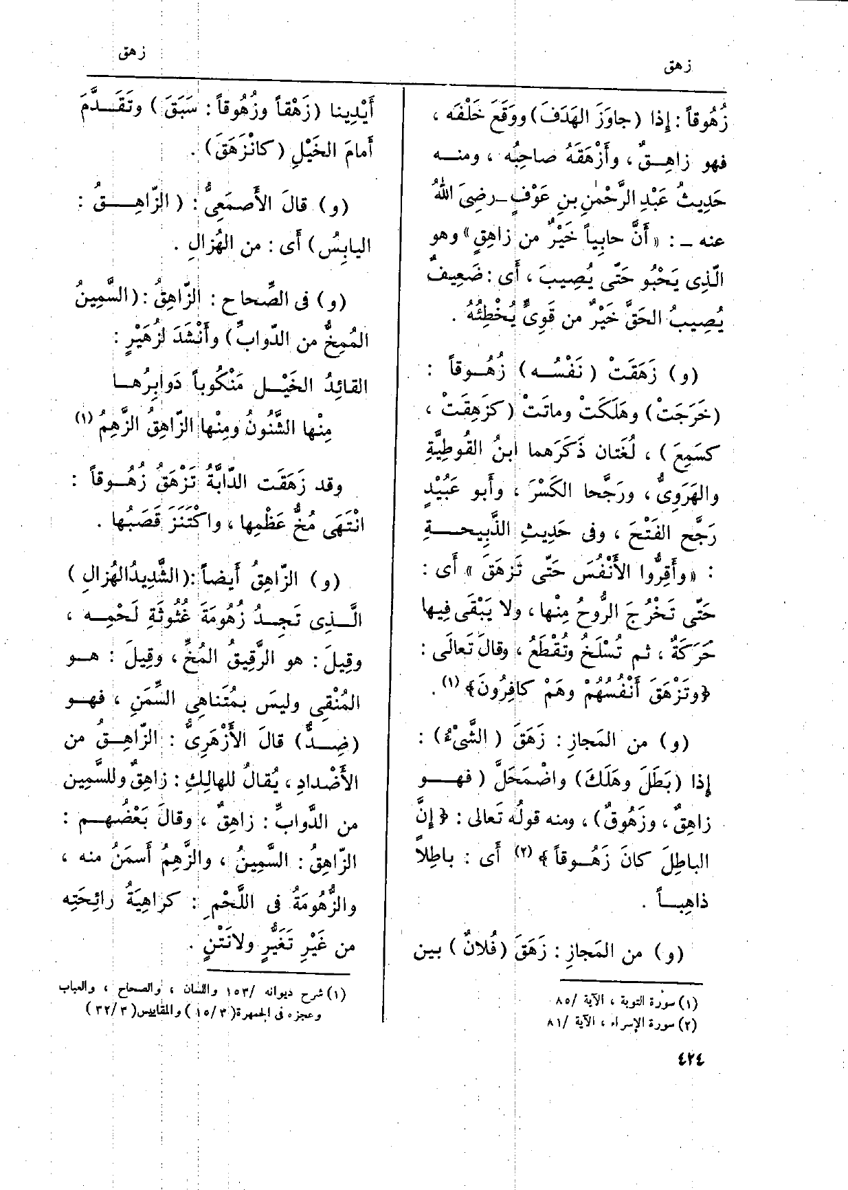 زُهُوقاً: إِذا جاوَزَ الهَدَفَ ووَقَعَ خَلْفَه، فَهُوَ زاهِقٌ، وأَزْهَقَهُ صاحِبُه، وَمِنْه حَدِيثُ عَبْدِ الرحمنِ بنِ عَوْفٍ رضِيَ اللهُ عَنهُ: أَنَّ حابِياً خَيْر من زاهِقٍ وَهُوَ الَّذِي يَحْبُو حتِّى يصِيبَ، أَي: ضَعِيف يُصِيبُ الحَقَّ خَيْرٌ من قَوِيٍّ يُخْطِئُهُ. وزَهَقَتْ نَفْسُه زُهُوقاً: خَرَجَتْ وهَلَكَتْ وماتَتْ كزَهِقَتْ، كسَمِعَ، لُغَتان ذَكَرَهما ابنُ القُوطِيةِ والهَرَوِيُّ، ورَجَّحا الكَسْرَ، وَأَبُو عَبيْدٍ رَجَّح الفَتْحَ، وَفِي حَدِيثِ الذَّبيحةِ: وأَقِرُّوا الأَنفُسَ حَتّى تَزهَقَ أَي: حَتى تَخْرُجَ الرُّوح مِنْها، وَلَا يَبْقَى فِيها حَرَكَة، ثمَّ تُسْلَخ وتُقْطَعُ، وقالَ تَعالَى: وتَزْهَقَ أَنْفُسهُمْ وهَمْ كافِرُونَ.