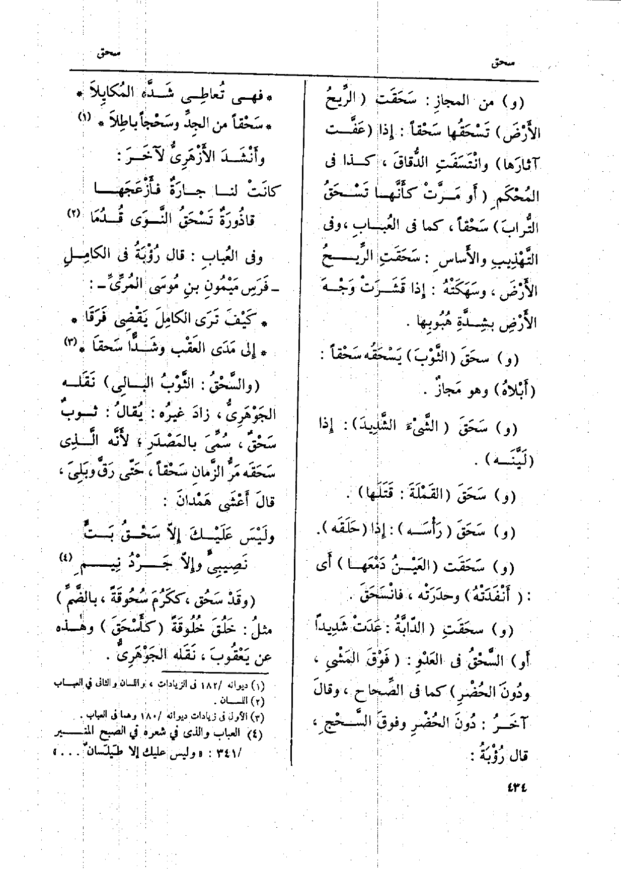 وَفِي العُبابِ: قَالَ رُؤْبَةُ فِي الكامِل فَرَسِ مَيْمُونِ بنِ مُوسَى المُرِّيِّ: كَيْفَ تَرَى الكامِلَ يَقْضِي فَرَقَا إِلَى مَدَى العَقْب وشدُّا سَحقاً والسحْقُ: الثوبُ البالِي نَقَله الجَوْهَرِي، زادَ غيرُه: يقالُ: ثوب سَحْقٌ، سُمِّيَ بالمصدَرِ، لِأَنَّهُ الذِي سَحَقَه مَر الزَّمانِ سَحقاً، حَتّى رَق وبَليَ، قالَ أَعْشَى هَمدانَ:
