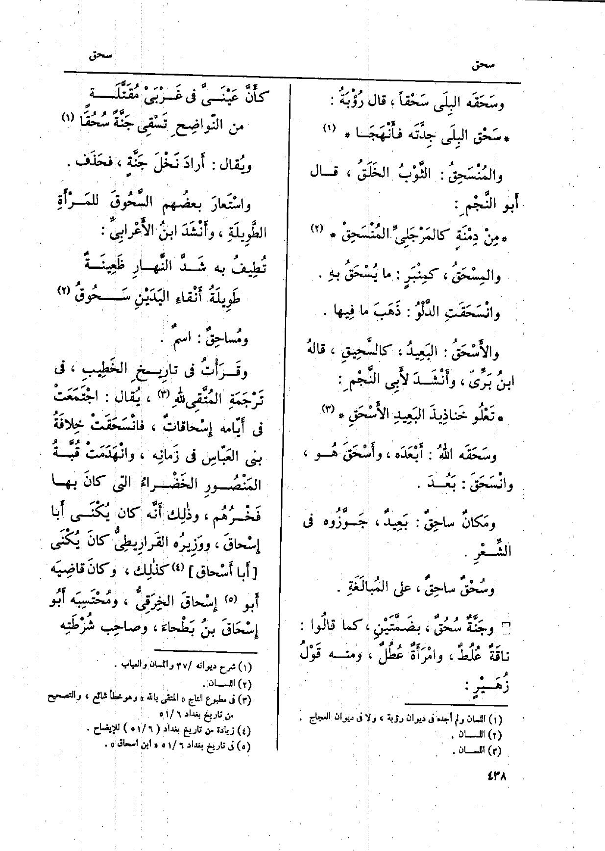 ومَكان ساحِق: بَعِيدٌ، جَوَّزُوه فِي الشِّعْرِ.
