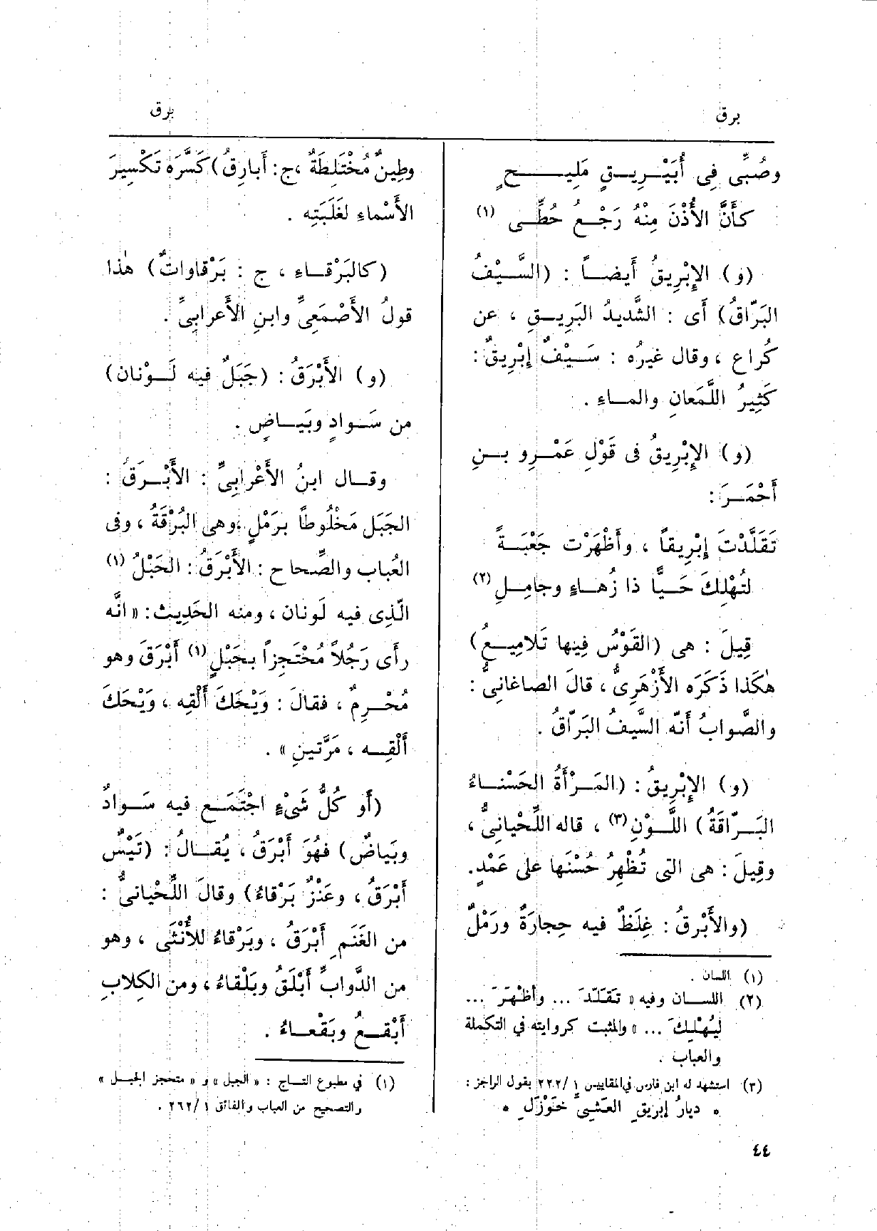 قِيلَ: هِيَ القَوْسُ فِيها تَلامِيع هكَذا ذَكَرَه الأزْهرِيّ، قالَ الصاغانِي: والصَّوابُ أَنه السَّيفُ البَرّاقُ. والإِبْرِيقُ: المَرْأَةُ الحَسناءُ البَرّاقَةُ اللَّونِ، قَالَه اللِّحْيانِيّ، وقِيلَ: هِيَ الَّتِي تُظْهِرُ حُسْنَها على عَمدٍ. والأَبرق: غِلَظٌ فِيهِ حِجارَةٌ ورَمْل وطِينٌ مُختَلِطَة، ج: أَباريق كَسَّره تّكسِيرَ الأَسماءِ)