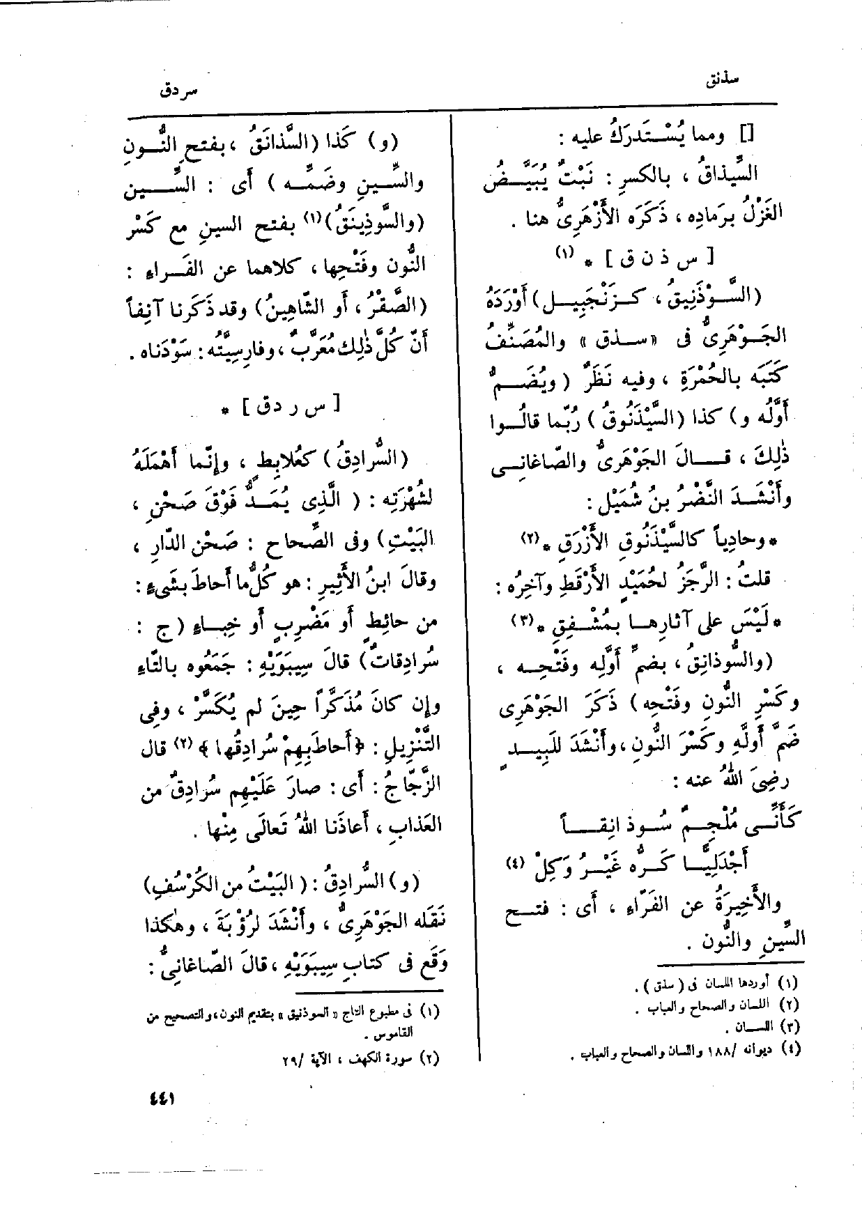 السَّوْذَنِيقُ، كزَنْجَبِيل أَوْردَهُ الجَوْهَرِيُّ فِي سذق والمُصَنِّفُ كَتَبَه بالحمْرَةِ، وَفِيه نَظَرٌ ويُضَم أَوَّله وَكَذَا السَّيْذَنُوقُ رُبّما قالُوا ذلِكَ، قالَ الجَوْهَري والصّاغانِي وأنشَدَ النَّضرُ بنُ شُمَيْل: وحادِياً كالسَّيْذَنُوقِ الأزْرَقِ قلتُ: الرَّجَزُ لحُمَيْد الأرْقَطِ وآخِرُه: لَيْسَ على آثارِها بمُشفِق والسوذانِقُ، بضمِّ أَوله وفَتحِه، وكَسْرِ النونِ وفَتْحِه ذَكَرَ الجَوْهَرِي ضَمَّ أَولَّهِ وكَسْرَ النونِ، وأنْشَدَ للَبِيد رضِيَ اللهُ عَنهُ: