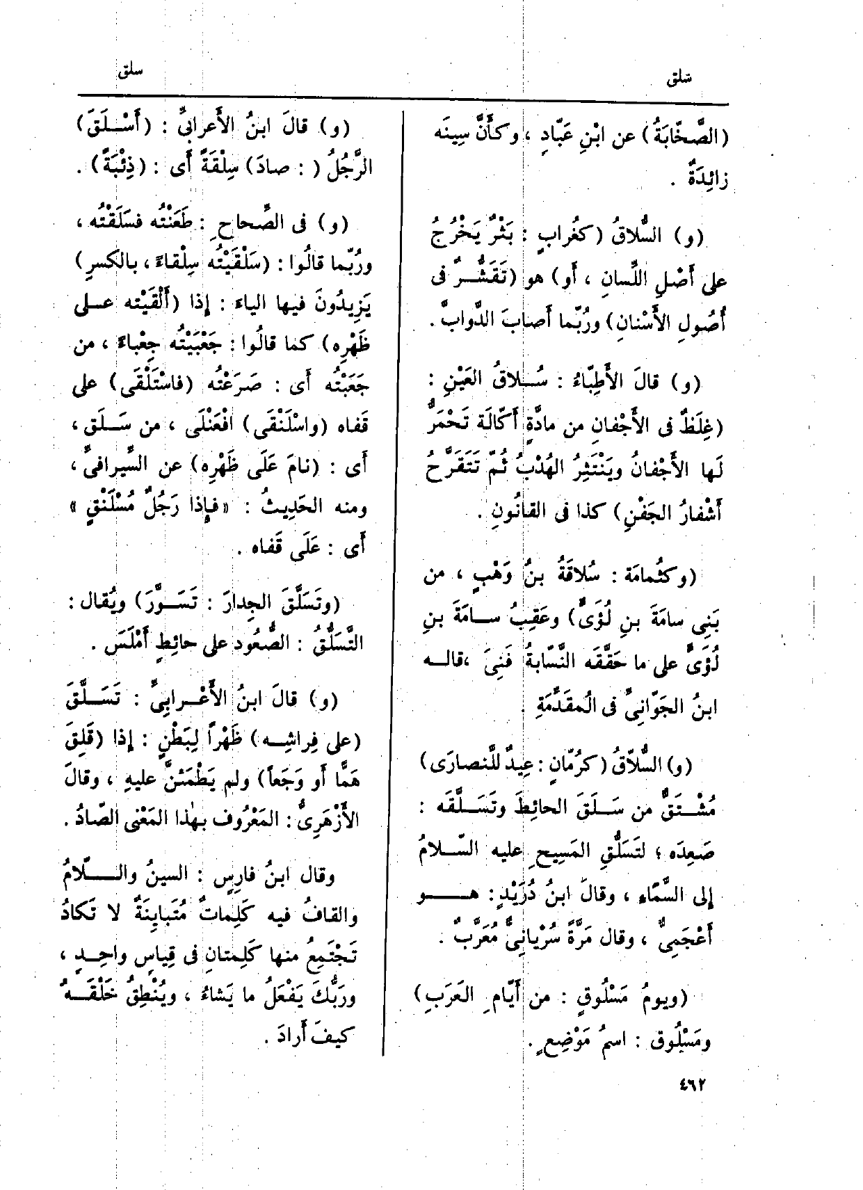 وَقَالَ ابنُ فارِسٍ: السينُ واللّامُ والقافُ فِيهِ كَلِماتٌ مُتَبايِنَة لَا تَكادُ تَجْتَمِعُ مِنْهَا كَلِمتانِ فِي قِياس وَاحِد، ورَبُّكَ يَفْعَلُ مَا يَشاءُ، ويُنْطِقُ خَلْقَهُ كيفَ أَرادَ.