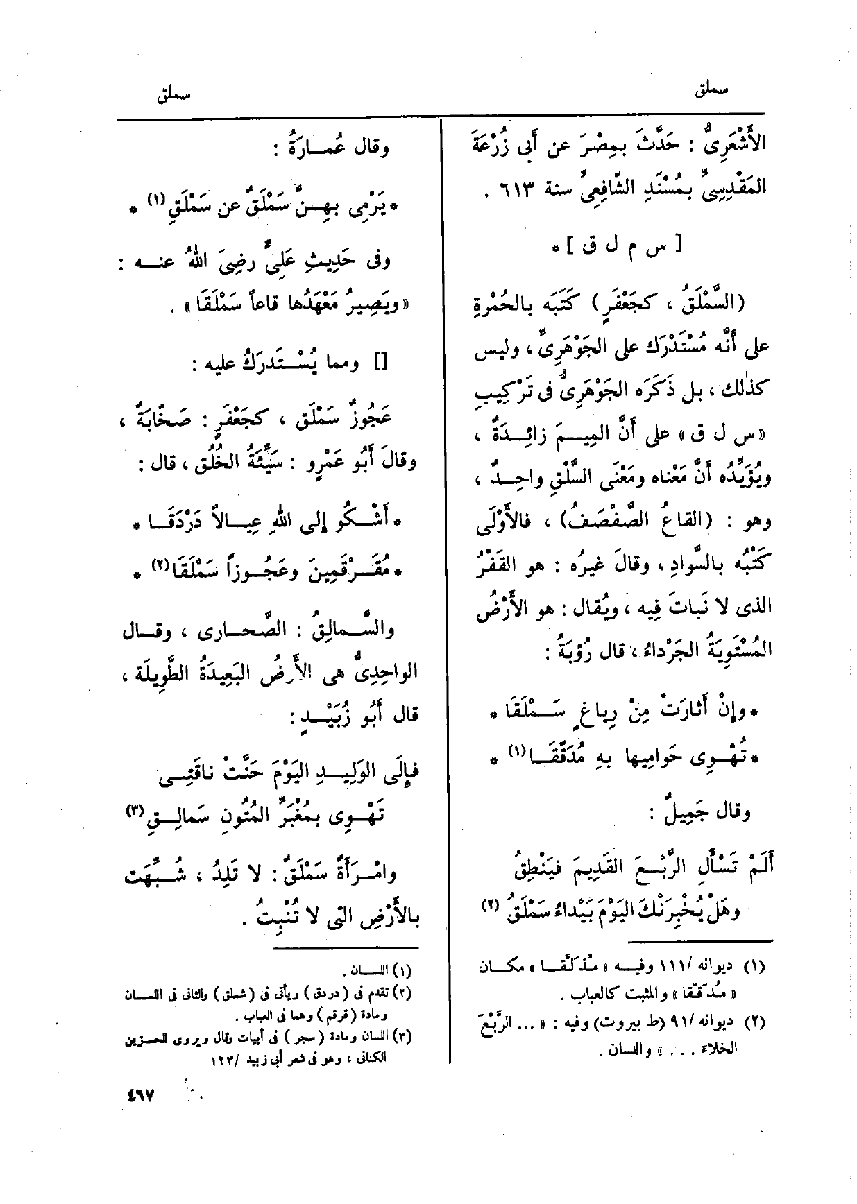 السمْلَقُ، كجَعْفَرٍ كَتَبَه بالحُمْرةِ على أنَّه مُسْتَدْرَك على الجَوْهَرِيِّ، وَلَيْسَ كَذَلِك، بل ذَكَرَه الجَوْهَرِي فِي تَرْكِيبِ س ل ق على أَنَّ المِيمَ زائِدَةٌ، ويُؤَيِّدُه أَنَّ مَعْناه ومَعْنَى السَّلْقِ واحِد، وَهُوَ: القاعُ الصفْصَفُ، فالأوْلَى كَتْبُه بالسَّوادِ، وقالَ غيرُه: هُوَ الَقفرُ الَّذِي لَا نَباتَ فِيه، ويُقال: هُوَ الأرْضُ المُسْتَوِيَةُ الجَرْداءُ، قَالَ رُؤبَةُ: وإِنْ أَثارَتْ مِن رِياغٍ سَمْلَقَا تُهْوِى حَوامِيها بهِ مُدَقّقَا وَقَالَ جَمِيلٌ: