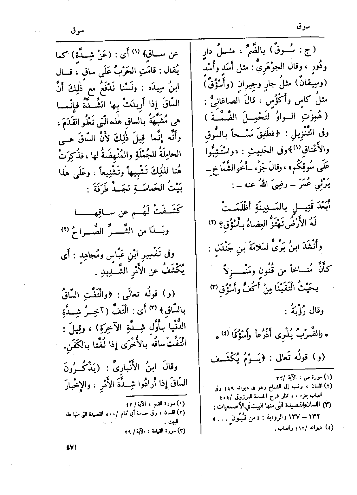 وَقَالَ رُؤْبَةُ: والضرْبُ يُذْرِى أذْرُعاً} وأَسْؤُقَا وقولُه تَعالى: يَوْمُ يُكْشَف عَن {سَاق أَي: عَنْ شِدّةٍ كَمَا يُقال: قامَتِ الحَرْبُ عَلَى} ساقٍ، قَالَ ابْن سِيدَه: ولَسْنا نَدْفَعُ مَعَ ذلِكَ أنَّ السّاقَ إِذا أَرِيدَتْ بهَا الشِّدَّةُ فإِنّما هِيَ مُشَبَّهَة {بالساق هَذه الّتي تَعْلُو القَدَمَ، وأَنَّه إِنَّمَا قِيلَ ذَلِكَ لأنُّ السّاقَ هِيَ الحامِلَةُ للجُمْلَةِ والمُنْهِضَةُ لَهَا، فذُكِرَت هُنا لذلِكَ تَشْبِيهاً وتَشْنِيعاً، وعَلَى هَذَا بَيْتُ الحَماَسةِ لجَدِّ طَرَفَةَ:
