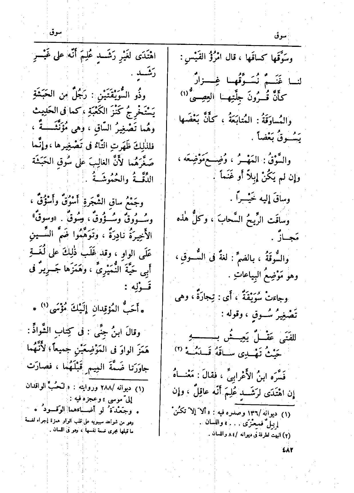 وجَمْعُ} ساقِ الشجَرةِ {أسْوُقٌ} وأسْؤقٌ، {وسُوُوقٌ} وسُؤُوقٌ، {وسُوق.} وسوقٌ الأخِيرَةُ نادِرَةٌ، وتَوَهَّموا ضمَّ السِّينِ عَلَى الواوِ، وَقد غَلَب ذلِكَ على لُغَةِ أَبِي حَيَّةَ النمَيْرِيِّ، وهَمَزَها جَرِير فِي قَوْلِه: أَحَبًّ المُؤقِدانِ إِلَيْكَ مُؤْسى وقالَ ابنُ جِنّي: فِي كِتابِ الشَّواذِّ: هَمَزَ الواوَ فِي المَوْضِعَيْنِ جَمِيعًا، لأنُّهُما جاوَرَتّا ضَمَّةَ المِيم قَبْلَهُما، فصارَت