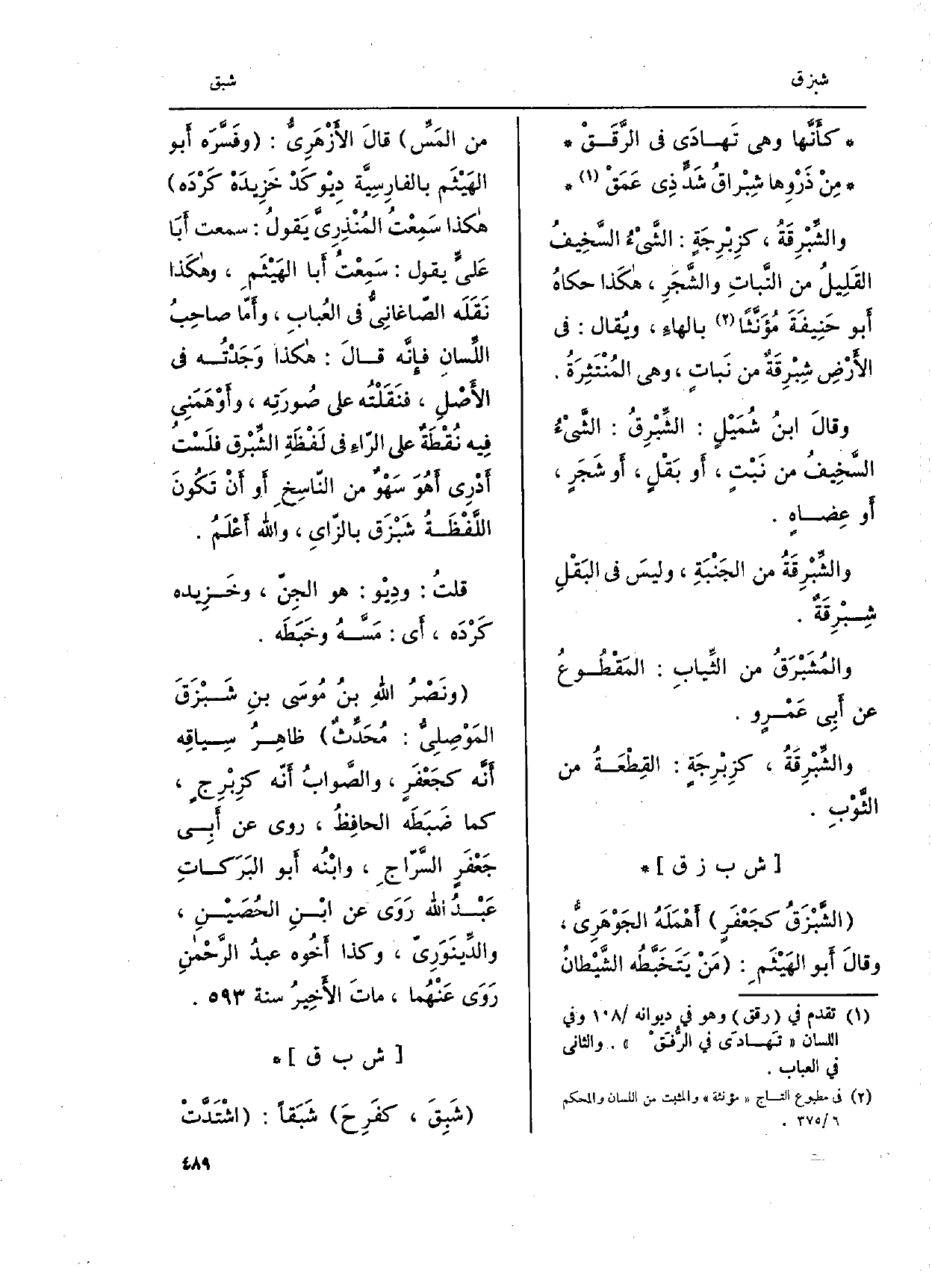 الشَّبْزَقُ كجَعْفر أَهْمَلَهُ الجَوْهَريًّ وقالَ أَبو الهَيْثَمِ: مَنْ يَتَخَبَّطُه الشَّيْطانُ من المَسِّ قالَ الأزْهَري: وفَسَّرَه أَبو الهَثيَم بالفارِسِية دِيو كَد خزِيدَهْ كَردَه هَكَذَا سَمِعْتُ المُنذرِيَّ يَقولُ: سَمِعت أبَا عَليٍّ يَقُول: سَمِعْتُ أَبا الهَيْثَم، وهكَذا نَقَلَه الصّاغانِيُّ فِي العُبابِ، وأَمّا صاحِبُ اللِّسان فَإِنَّهُ قالَ: هَكَذَا وَجَدْتُه فِي الأصْلِ، فنَقَلْتُه على صُورَتِه، وأَوْهَمَنِي فِيه نُقطَة على الرّاءَ فِي لَفْظَةِ الشِّبْرق فلَسْت أدْرِي أهوَ سَهْوٌ من النّاسِخ أَو أَنْ تَكُونَ اللَّفْظةُ شَبْزَق بالزّايِ، وَالله أَعْلَمُ.