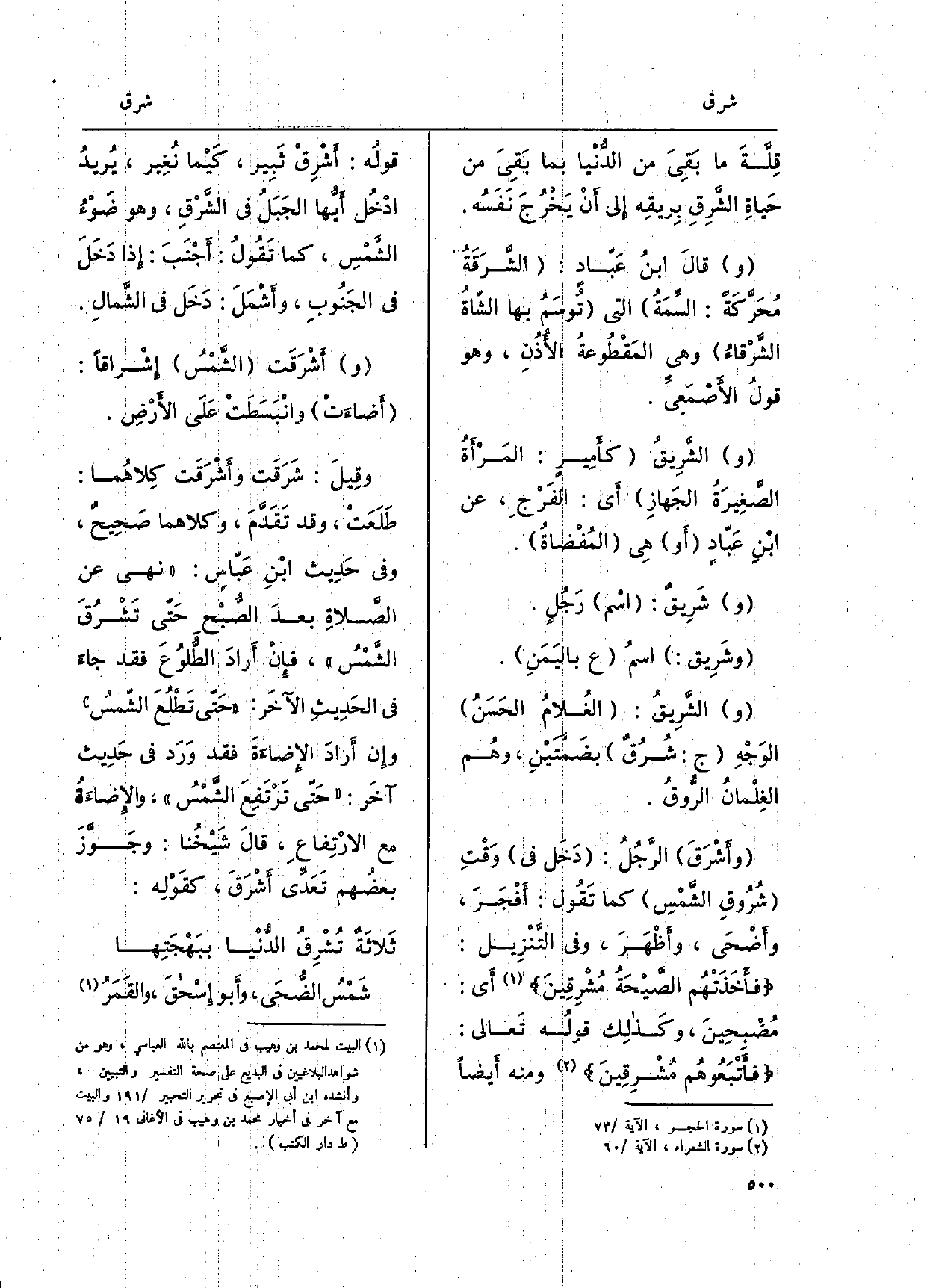 وشَرِيق: اسْم رَجُلٍ. وشَرِيق: اسمُ ع باليَمَنِ، والشَّرِيقُ: الغلامُ الحَسَنُ الوَجهِ ج: شُرُقٌ بضَمتَيْنِ، وهُم الغِلْمانُ الرُّوقُ. وأَشْرَقَ الرَّجُلُ: دَخَل فِي وَقْتِ شرُوقِ الشمْسِ كَمَا تَقُول: أَفْجَرَ، وأَضْحَى، وأظْهَرَ، وَفِي التَّنْزِيل: فأخَذَتْهم الصَّيْحَةُ مُشْرِقِينَ أَي: مُصبحِينَ، وكذلِك قَوْله تَعالى: فأًتْبَعُوهُم مشْرِقِينَ وَمِنْه أَيضاً قولُه: أَشْرِق ثَبِير، كَيْما نغِير، يُريدُ ادْخُل أَيُّها الجَبَل فِي الشَّرْقِ، وَهُوَ ضَوْء: الشَّمْسِ، كَمَا تَقُول: أَجْنَبَ: إِذا دَخَلَ فِي الجَنُوبِ، وأّشْمَلَ: دَخَل فِي الشَّمالِ.