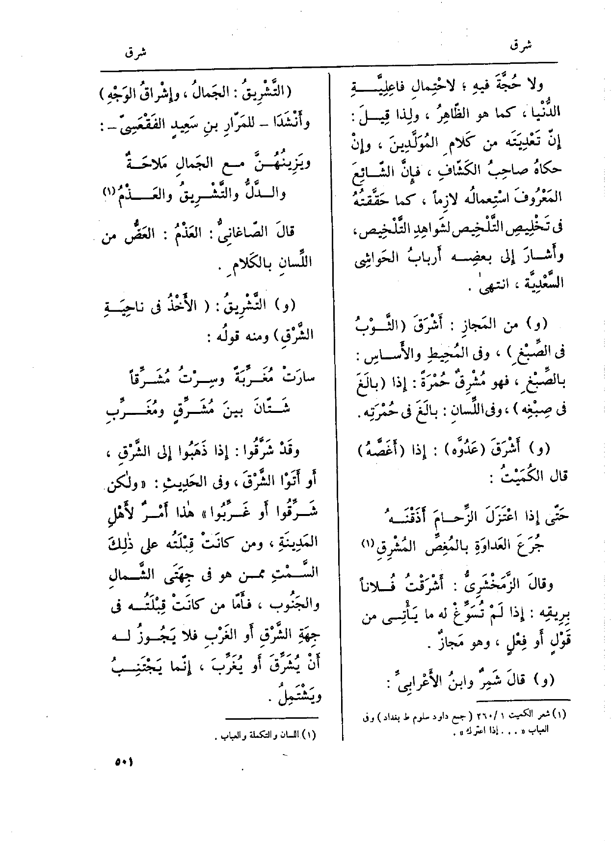 وقالَ الزَّمَخْشَرِي: أشرَقْت فُلاناً بِرِيقِه: إِذا لَمْ تُسَوِّغْ لَهُ مَا يَأْتِي من قَولٍ أَو فِعْلٍ، وَهُوَ مَجازٌ وقالَ شَمِرٌ وَابْن الأَعرابي: التَّشريقُ: الجَمالُ، وإِشْراقُ الوَجهِ وأشَراق الْوَجْه وأنشدا للمَرّارِ بنِ سَعِيدٍ الفَقْعَسِي: