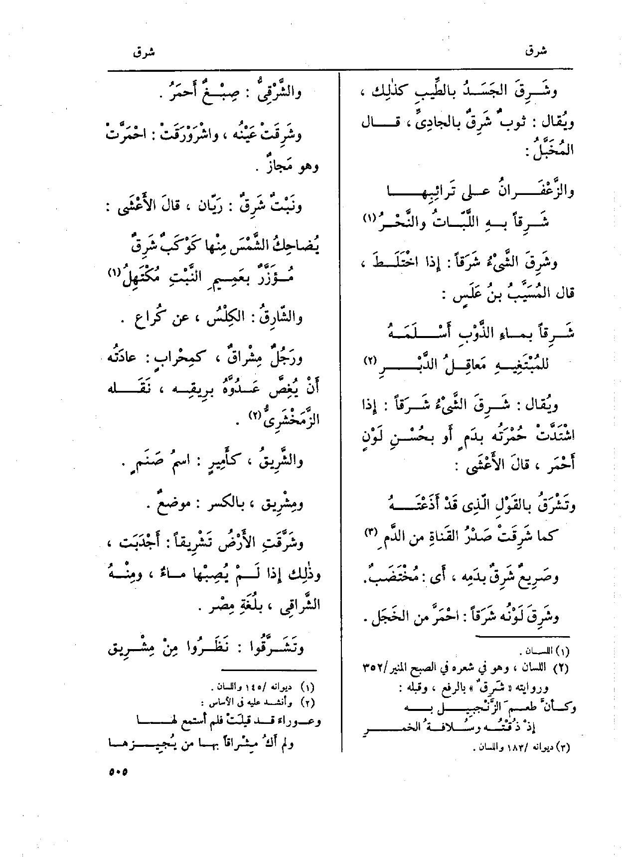 وصَرِيعٌ شَرِقٌ بدَمِه، أَي: مُخْتَضَبٌ. وشَرقَ لَوْنُه شَرَقاً: احْمَرَّ من الخَجَل. والشَّرْقِيُّ: صِبْغ أَحمَرُ. وشَرِقَتْ عَيْنه، واشرورَقَتْ: احْمَرَّتْ وَهُوَ مًجازٌ. ونَبْتٌ شَرِقِّ: رَيّان، قالَ الأعْشَى:)