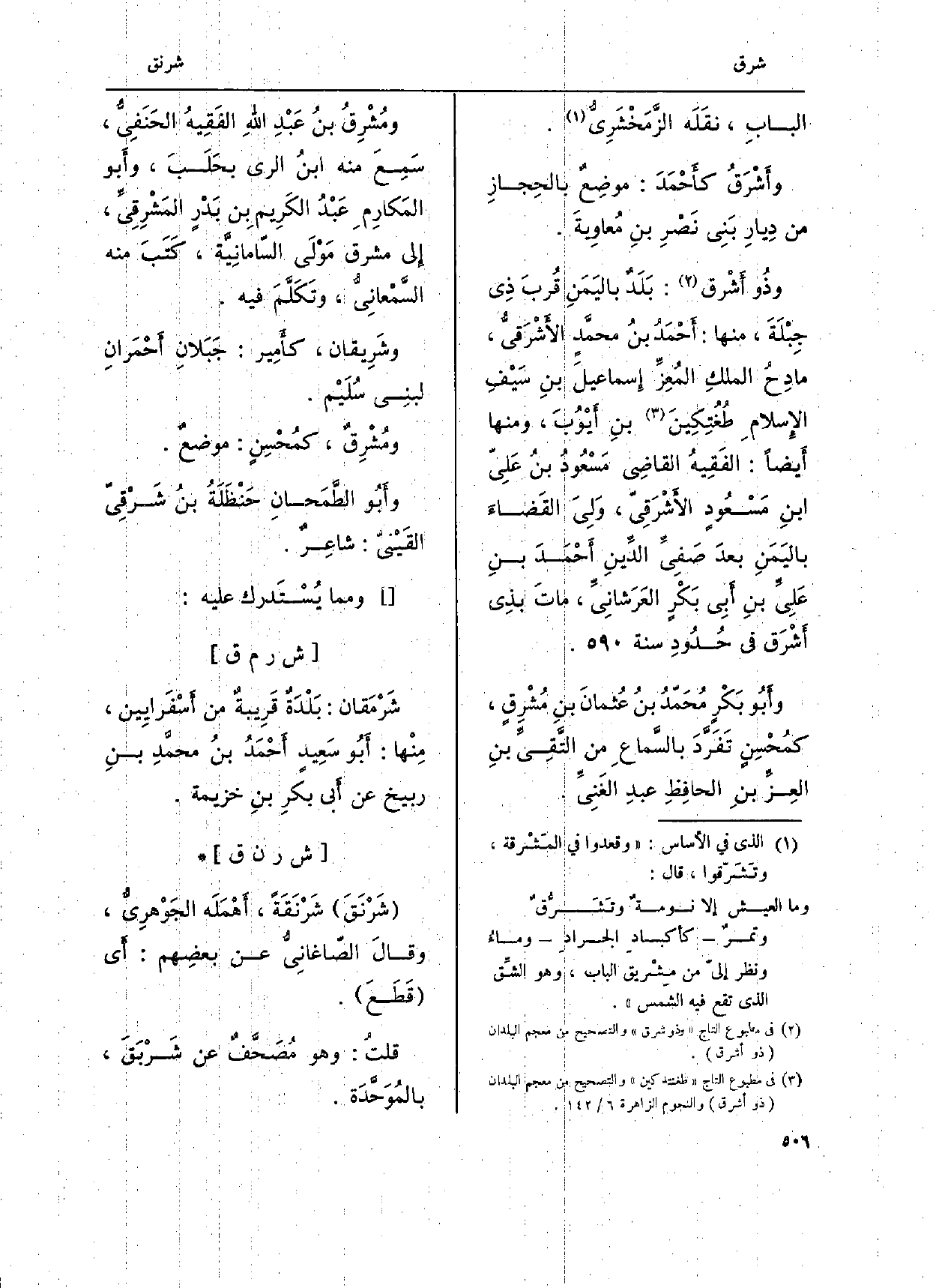 الْبَاب، نَقله الزَّمَخْشَرِيّ. وأشرق كأحمَدَ: موضِع بالحِجاز من دِيارِ بَنِي نَصر بن مُعاوِيةَ. وَذُو أشرق: بَلَد باليَمن قربَ ذِي جِبْلَةَ، مِنْهَا: أَحْمد بنُ مُحَمَّد الأَشرقيُّ، مادِحُ الملكِ المُعِز إِسْمَاعِيل بنِ سَيف الإِسلام طُغتِكِينَ بن أَيوبَ، وَمِنْهَا أَيْضا: َ الفَقِيهُ القاضِي مَسعُود بنُ عليّ ابْن مَسعودٍ الأشْرَقيّ، وَلي القَضاءَ باليَمنِ بعدَ صَفِيِّ الدينِ أحْمَدَ بنِ عَلِيِّ بنِ أَبِي بَكرٍ العَرَشانِيِّ، ماتَ بِذِي أشْرَق فِي حُدودِ سنة. وأبُو بَكْرٍ محَمّدُ بنُ عُثمانَ بن مشْرقٍ، كمحْسِن تَفَرَّدَ بالسمَّاعَ من التَقِىًّ بنِ العِزِّ بن الحافِظِ عبدِ الغَنِي ومشرِق بنُ عَبدِ اللهِ الْفَقِيه الحَنَفي،، سَمعَ مِنْهُ ابْن الرّيّ بحَلَبَ، وَأَبُو المَكارِم عبْد الكَرِيم بِن بَدرٍ المَشرقِيّ، إِلى مشرق مولَى السّامانِية، كَتَب مِنْهُ السَّمْعَانِيّ وتكَلمَ فِيهِ. وشرِيقان، كأَمِير: جَبَلانِ أَحمَرانِ لبني سليم. ومشرق، كمحْسِنٍ: مَوضِع. وأَبُو الطَّمَحانِ حَنظَلَة بنُ شَرقِي القينيّ: شاعِر.