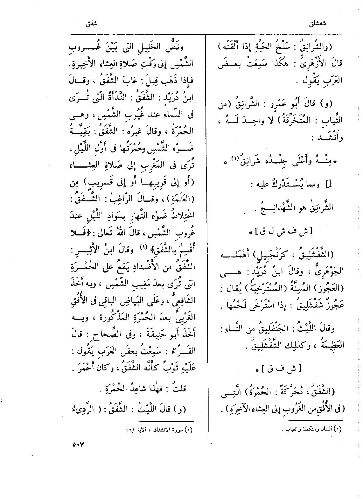 الشفَقُ، محَركَةً: الحمرةُ الَّتِي فِي الأفُقِ من الغروبِ إِلى العِشاء الْآخِرَة. وَنَصّ الْخَلِيل الَّتِي بَين غرُوب الشَّمْس إِلَى وَقت صَلَاة الْعشَاء الْأَخِيرَة. فَإِذا ذهب قيل: غَابَ الشَّفق وَقَالَ ابْن دُرَيْد الشَّفق: الندأة الَّتِي ترى فِي السَّمَاء عِنْد غيوب الشَّمْس وَهِي الْحمرَة وَقَالَ غَيره الشَّفق: بَقِيَّة ضوء الشَّمْس وحمرتها فِي أول اللَّيْل، ترى فِي الْمغرب إِلَى صَلَاة الْعشَاء أَو إِلَى قريبها أَو إِلَى قريب من الْعَتَمَة وَقَالَ الرَّاغِب: الشَّفق اخْتِلَاط ضوء النَّهَار بسواد اللَّيْل عِنْد غرُوب الشَّمْس قَالَ الله تَعَالَى فَلَا أقسم بالشفق وَقَالَ ابْن الْأَثِير الشَّفق من الأضداد يَقع على الْحمرَة الَّتِي بعد مغيب الشَّمْس وَبِه أَخذ الشَّافِعِي وعَلى الْبيَاض الْبَاقِي فِي الْأُفق الغربي بعد الْحمرَة الْمَذْكُورَة وَبِه أَخذ أَبُو حنيفَة وَفِي الصِّحَاح قَالَ الْفراء سَمِعت بعض الْعَرَب يَقُول عَلَيْهِ كَأَنَّهُ الشَّفق وَكَانَ أَحْمَر قلت فَهَذَا شَاهد الْحمرَة. وَقَالَ اللَّيْث: الشَّفق الردئ من