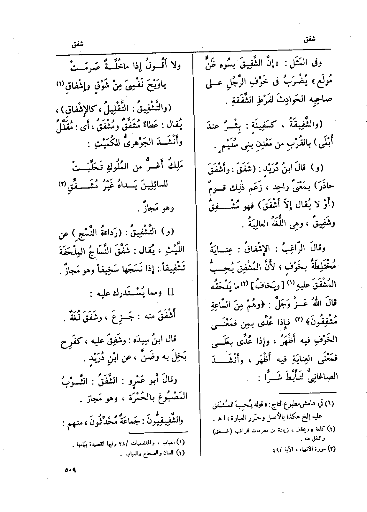 الشَّفَقةِ. والشَّفِيقَة، كسَفِينَة: بِئْرٌ عندَ أبْلَى بالقُرْبِ من مَعْدِنِ بنِي سُلَيم. وقالَ ابْن دُرَيدٍ: شَفَقَ، أشْفق حاذرَ بمَعْنىً واحِد، زَعَم ذلِك قوم أَوْ لَا يُقال إِلاّ أشْفَقَ فَهُوَ مُشْفِق وشَفِيق، وهِى اللغَةُ العالِيَة. وقالَ الرّاغِبُ: الإِشفاقُ: عِنايَةٌ مخْتَلِطَةٌ بخَوْفٍ لأَنَّ المُشْفِقَ يُحبُّ المُشْفَقَ عليهِ ويَخافُ، مَا يَلْحَقُه قالَ اللهُ عَزَّ وَجَلَّ: وهُمْ مِنَ السّاعِةِ مُشْفِقُونَ فإِذا عُدِّى بمِن فمَعْنَى الخَوفِ فِيهِ أَظْهَرُ، وَإِذا عُدِّى بعَلَى فمَعنَى العِنايَةِ فِيهِ أَظْهر، وأَنْشدَ الصاغانِي لتَأبَّطَ شَرّاً: