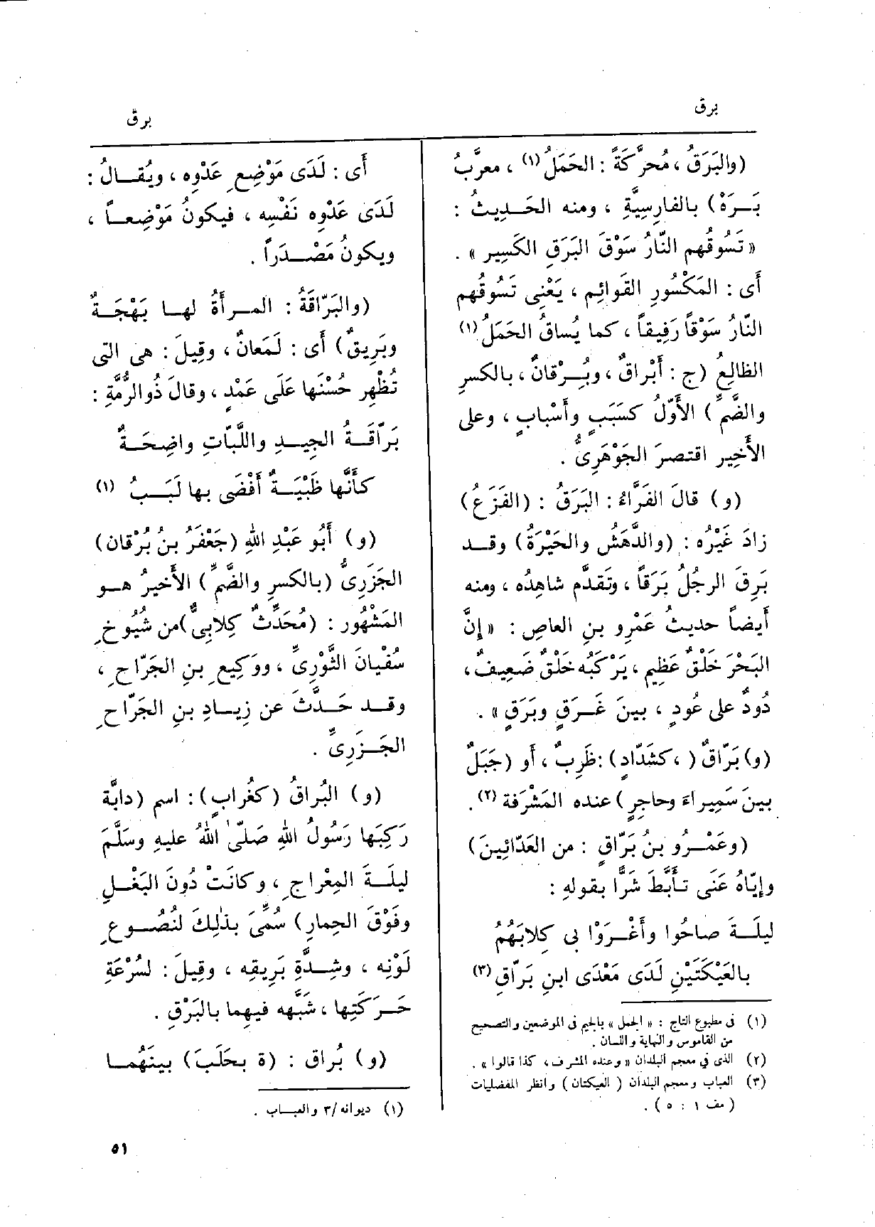 والبَرَقُ، مُحرَّكَةً: الحَمَلُ، معرَّبُ بَرَهْ بالفارِسِيَّةِ، وَمِنْه الحَدِيث: تَسُوقُهم النّارُ سَوْقَ البَرَقِ الكَسِير. أَي: المَكْسُورِ القَوائِم، يَعْنِي تَسُوقُهم النّارُ سَوْقاً رَفِيقاً، كَمَا يُساقُ الحَمَلُ الظالعُ ج: أَبْراقٌ، وبُرْقانٌ، بالكسرِ والضَّمَ الأَوّلُ كسَبَبٍ وأَسْبابٍ، وعَلى الأَخِير اقتصرَ الجَوْهَرِي.