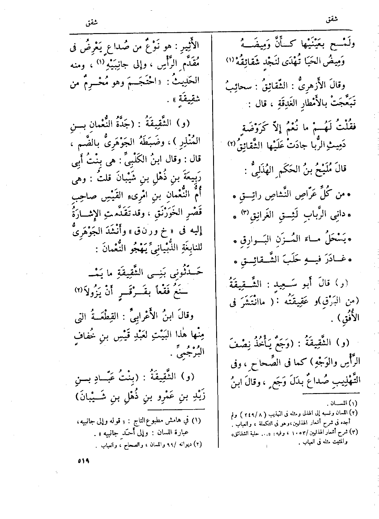 قَالَ مُلَيْحُ بن الحكمِ الهُذليُّ: من كُلِّ عَرّاصِ النَّشاصِ راتِقِ دانِي الرَّبابِ لَثِقِ الغَرانِقِ ويَسْحَلُ ماءَ المُزَنِ البَوارِقِ غادَرَ فيهِ حَلَبَ الشَّقائِقِ وَقَالَ أَبُو سَعيدٍ: الشَّقِيقَةُ من البَرْقِ وعَقِيقَتُه: مَا انْتَشَرَ فِي الأُفُقِ. (و) ! الشَّقِيقَةُ: وَجَعٌ يَأْخُذُ نِصْفَ الرأَسِ والوَجْهِ كَمَا فِي الصحاحِ، وَفِي التهذْيبِ صُداعٌ بَدَلَ وَجَعٍ، وقالَ ابنُ الأَثيرِ: هُوَ نَوْعٌ من صُداعٍ يَعْرِضُ فِي مُقَدَّمِ الرَّأْسِ، وَإِلَى جانِبَيْهِ، وَمِنْه الحديثُ: احْتَجَمَ وَهُوَ مُحْرِمٌ من شقِيقَةٍ.