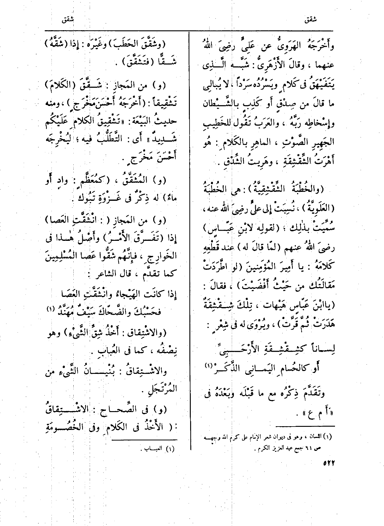 والخُطْبَةُ} الشِّقْشِقِيَّةُ: هِيَ الخُطْبَةُ العَلَوِيَّةُ، نسبت إِلَى عَليّ رَضِي الله عَنهُ سُمِّيتْ بذل: لقولِه لابْنِ عبّاسٍ رَضِي الله عَنْهُم لمّا قَالَ لَهُ عِنْد قَطْعِهِ كَلامَهُ: يَا أَمِيرَ المؤمِنينَ لَو اطَّرَدَتْ مَقالَتُك من حَيْثُ أَفْضَيْتَ، فقالَ: يَا ابنَ عباسٍ هَيهات، وتِلْكَ {شقْشِقَةٌ هَدَرَتْ ثُمَّ قَرَّتْ ويُرْوَى لَهُ فِي شِعْرٍ: