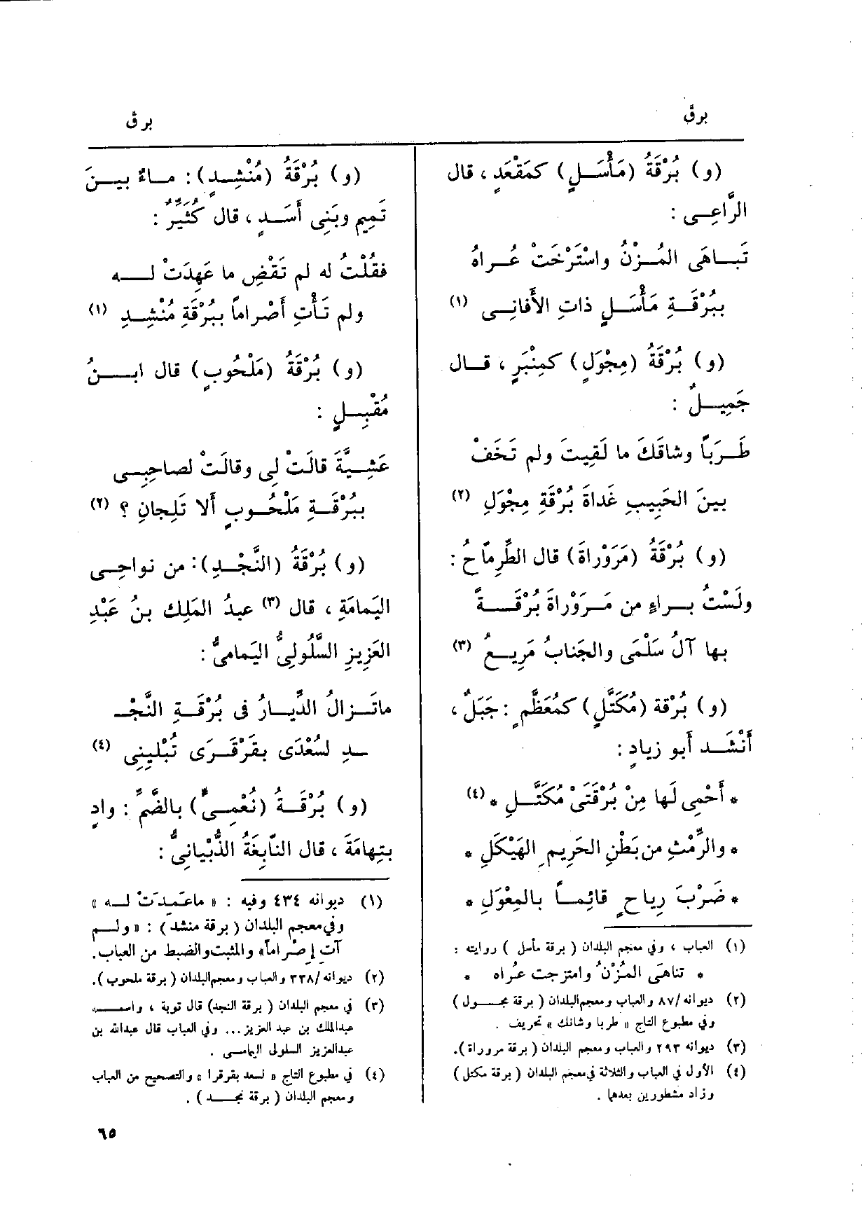 وبرْقة مُكَتَّلٍ كمُعَظَّم: جَبَلٌ، أنْشَد أَبُو زيادٍ: أحْمِى لَها مِنْ بُرْقَتَي مُكَتَّل والرِّمْثِ من بَطْنِ الحَرِيم الهَيْكَلِ ضَرْبَ رِياح قائِماً بالمِعْوَلِ وبُرْقَةُ مُنْشدٍ: ماءٌ بينَ تَمِيم وبَنِى أَسَدٍ، قَالَ كُثَيِّرٌ: