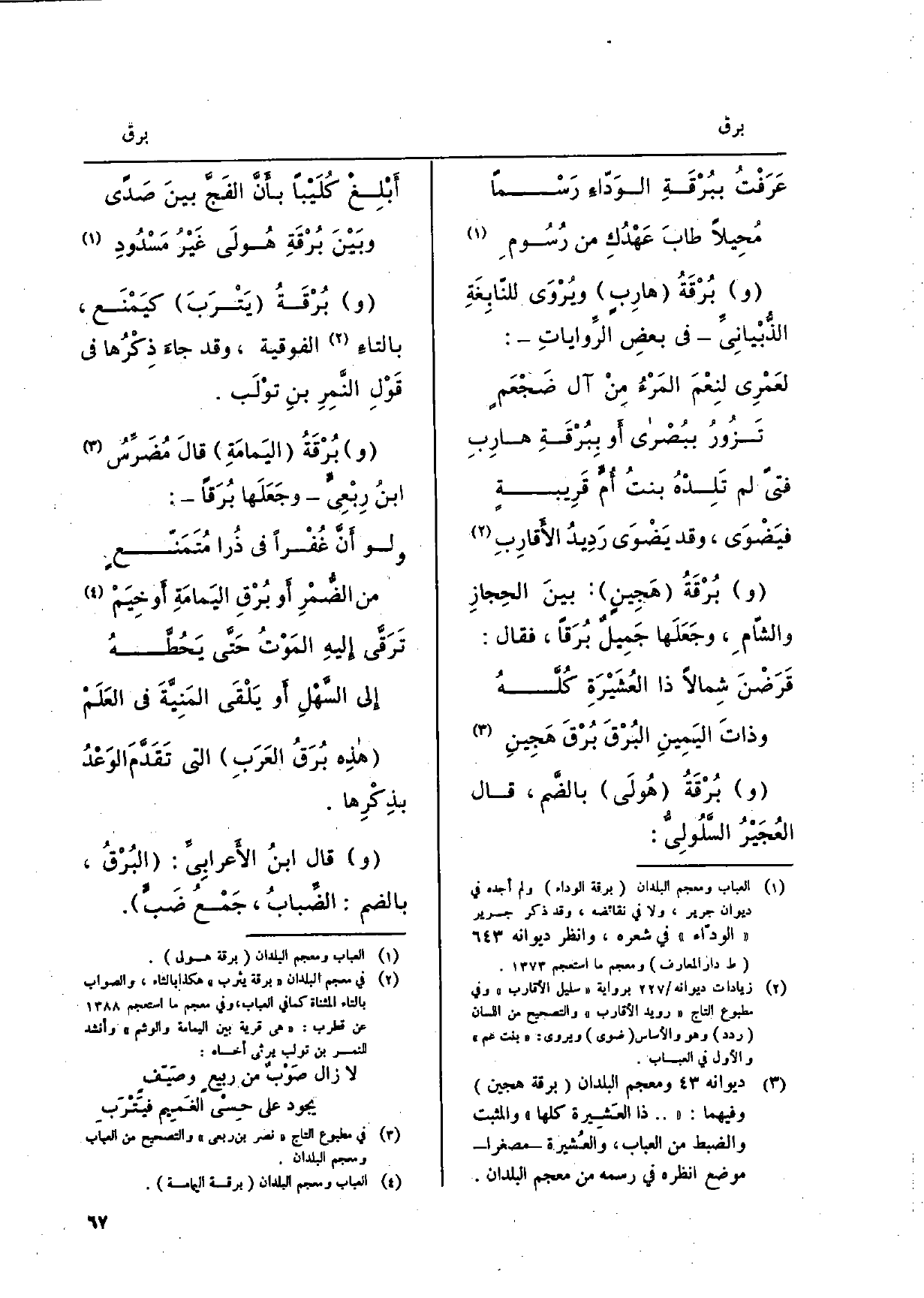 وبُرْقَةُ يَتْرَبَ كيَمنَع، بالتاءَ الْفَوْقِيَّة، وَقد جاءَ ذِكْرُها فِي قَوْلِ النَّمِرِ بنِ توْلَب. وبُرقَة اليَمامَةِ قالَ مُضَرِّسُ ابنُ رِبعي وجَعَلَها بُرَقاً:
