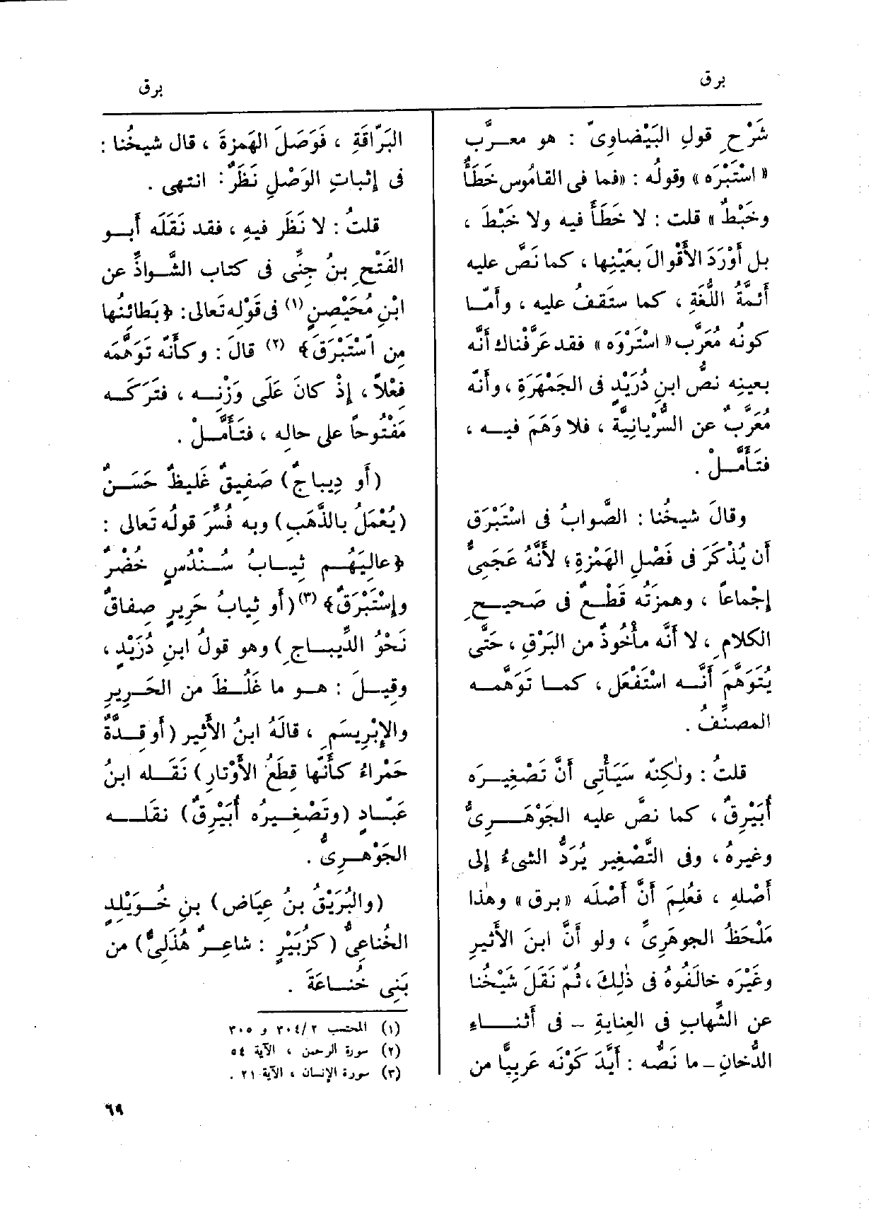 شرح قولِ البَيْضاوِيّ: هُوَ معرَّب اسْتَبْرَه وَقَوله: فَمَا فِي القامُوس خَطَأ وخبطِّ قلت: لَا خَطَأ فِيهِ وَلَا خبْطَ، بل أوْرَدَ الأَقْوالَ بعَيْنِها، كَمَا نَصَّ عَلَيْهِ أَئمَّةُ اللغَةِ، كَمَا ستَقفُ عَلَيْهِ، وأَمّا كونُه مُعَرَّب اسْتَرْوَه فقد عَرَّفْناك أنَّه بعينِه نصُّ ابنِ دُرَيْدٍ فِي الجَمْهَرَةِ، وأَنه مُعَرَّبٌ عَن السّرْيانِية، فَلَا وَهَمَ فِيهِ، فتَأمَّلْ. وقالَ شَيخنَا: الصَّوابُ فِي اسْتَبْرَق أَن يُذْكَرَ فِي فَصْلِ الهَمْزةِ، لأنَّهُ عَجَمِيّ إِجْمَاعًا، وهمزَته قَطْع فِي صَحيح الْكَلَام، لَا أَنَّه مأخُوذ من البَرْقِ، حَتى يُتَوَهَّمَ أَنه اسْتَفْعَل، كَمَا تَوَهَّمه المصنِّفُ. قلتُ: ولكِنّه سَيأتِي أنَّ تَصْغِيرَه أبَيْرِق، كَمَا نصَّ عَلَيْهِ الجَوْهَرِيّ وغيرهُ، وَفِي التصغِير يرَد الشيءُ إِلى أصلهِ، فعُلِمَ أَنَّ أَصلَه برق وَهَذَا مَلحَظُ الجوهَرِيِّ، وَلَو أنَّ ابْن الأَثيرِ وغَيْرَه خالَفُوهُ فِي ذلِكَ، ثُمّ نَقَلَ شَيخُنا عَن الشَهابِ فِي العِنايةِ فِي أَثناءَ الدُّخان مَا نَصه: أَيَّدَ كَوْنَه عربِياً من البَرّاقَةِ، فَوَصَلَ الهَمزةَ، قَالَ شيخُنا: فِي إِثباتِ الوَصْلِ نَظَرٌ: انْتهى. قلت: لَا نَظَر فيهِ، فقد نَقَلَه أَبو الفَتْح بنُ جِنِّي فِي كتاب الشَّواذِّ عَن ابنِ مُحَيْصِنٍ فِي قَوْلِه تَعالى: بَطائنُها من اسْتَبْرَقَ قالَ: وَكَأَنَّهُ تَوَهمَه فِعْلاً، إذْ كانَ عَلَى وَزْنه، فتَرَكَه مَفْتُوحاً على حالِه، فتَأملْ. أَو دِيباجٌ صَفِيقٌ غَليظٌ حَسَن يُعْمَلُ بالذَّهَبِ وَبِه فُسِّرَ قولُه تَعالى: عالِيَهُم ثِيابُ سُنْدُس خُضرٌ وإِسْتَبْرَق أَو ثِياب حَرِيرٍ صِفاق نَحْوُ الديباج وَهُوَ قولُ ابنِ دُريْد وقِيلَ: هُوَ مَا غَلُظَ من الحَرِيرِ والإِبْرِيسَم، قالَهُ ابنُ الأثِير أَو قِدَّة حَمْراء كأَنها قِطَعُ الأوْتارِ نَقَله ابنُ عَبّادٍ وتَصْغِيرُه أبَيرِق نقَله الجَوْهري. والبرَيقُ بنُ عِيَاض بنِ خُوَيْلِدٍ الخُناعِي كزُبَيْرٍ: شاعِرٌ هُذَلِي من بَني خُناعَةَ.