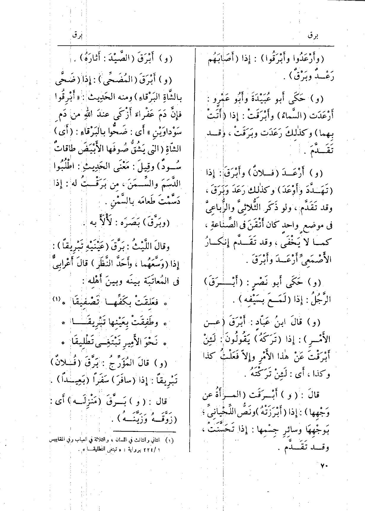 فعَلِقَتْ بكَفِّها تصفِيقَا وطَفِقَتْ بِعَيْنِها تَبْرِيقاً نَحْوَ الأَمِيرِ تَبْتَغِي تَطْلِيقَا وقالَ المُؤَرِّخ: برَّقَ فُلان تَبْريقاً: إِذا سافَرَ سفرا بعِيداً. قَالَ: وبرق منْزِلَه إِي زَوقه وَزَنه.