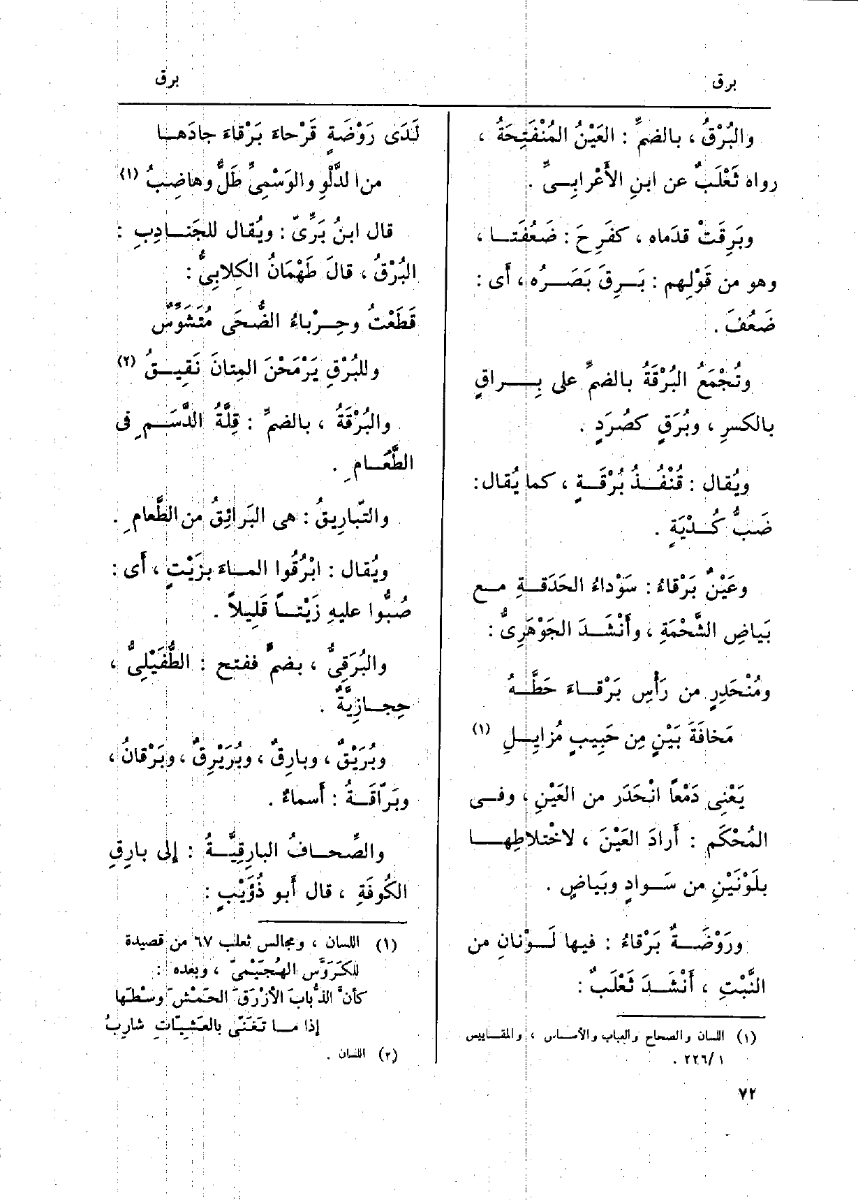والبرْقَةُ، بالضمِّ. قلَّة الدَّسَم فِي الطعُامَ. والتبّارِيقُ: هِيَ البَرائِقُ من الطَّعامَ. ويُقال: ابرُقُوا المَاء بزَيْت، أَي: صُبوا عليهِ زَيتاً قلِيلاً. والبُرقِي، بِضَم فَفتح: الطفيلي حِجازِيَة. وبرَيْقٌ، وبارِقٌ، وبُرَيرق، وبَرْقانُ، وبَراقَة: أَسمَاء. والصِّحافُ البارِقِيَّة: إِلى بارِقِ الكُوفَة، قَالَ أَبو ذُؤَيْبٍ: