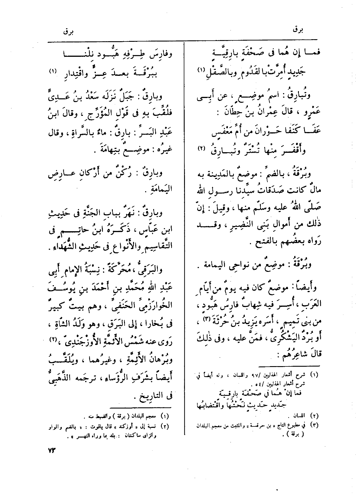 وبُرْقَةُ، بالضمِّ: مَوضِع بالمَدِينة بِهِ مَال كَانَت صَدَقاتُ سيِّدِنا رسولِ الله صَلىّ الله عَلَيْهِ وسَلم مِنْهَا، وقِيلَ: إِنّ ذَلِك من أَموالِ بَنِي النَّضِيرِ، وَقد رَواه بَعضهم بِالْفَتْح. وبرْقَةُ: موضِعٌ من نواحِي الْيَمَامَة. وَأَيْضًا: موضعٌ كَانَ فِيهِ يَوْم من أَيام العَرَبِ، أسِرَ فِيهِ شِهابٌ فارِس هَبُّود، من بني تَمِيم، أَسَره يَزِيدُ بنُ حُرْثَةَ، أَو بُرد اليَشكُرِيُّ، فمَنَّ عَلَيْهِ، وَفِي ذلِكَ قالَ شاعِرُهُم: