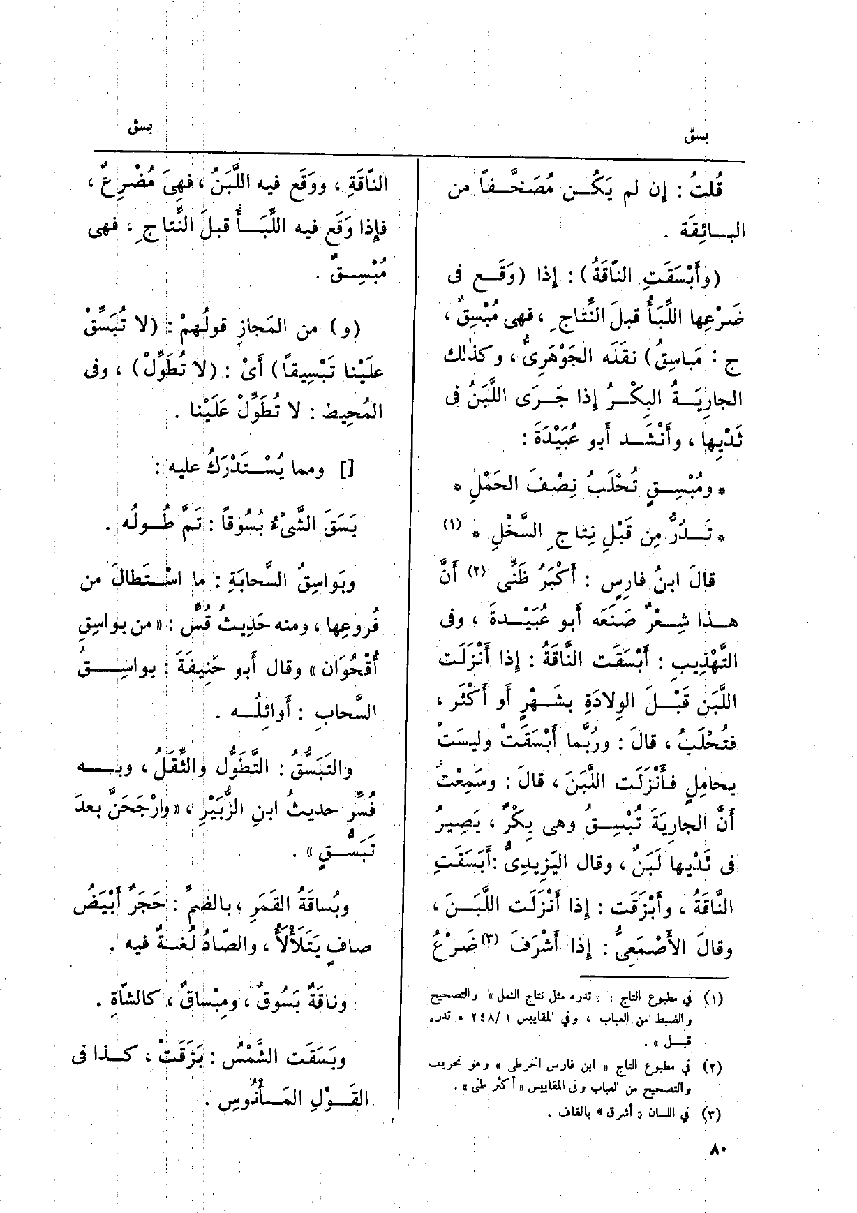 البائِقَة. وأَبْسَقَتِ الناّقَةُ: إِذا وَقَع فِي ضَرْعِها اللِّبَأ قبلَ النِّتاج، فَهِيَ مبسِقٌ، ج: مَباسِقُ نقَلَه الجَوْهَرِي، وَكَذَلِكَ الجارِيَةُ البِكْرُ إِذا جَرَى اللَّبَنُ فِي ثَدْيِها، وأَنْشَد أَبو عُبَيدَةَ: ومُبْسِقٍ تُحْلَبُ نِصْفَ الحَمْلِ تَدُر مِن قَبْلِ نِتاج السَّخْلِ قالَ ابنُ فارِسٍ: أَكْبَرُ ظَنِّي أَنَّ هَذَا شِعْرٌ صَنَعَه أَبُو عبيْدةَ، وَفِي التَّهْذِيبِ: أبْسَقَت النَّاقَةُ: إِذا أَنْزَلَت اللَّبَن قَبْلَ الوِلادَةِ بشَهْرٍ أَو أَكْثَر، فتُحْلَبُ، قالَ: ورُبما أبْسَقَتْ وليسَتْ بحامِلٍ فأَنْزَلَت اللَّبَنَ، قالَ: وسَمِعْت أَنَّ الجارِيَةَ تُبْسقُ وَهِي بِكْرٌ، يَصيرُ فِي ثَدْيها لَبَنٌ، وَقَالَ اليَزِيدِي: أَبسَقَتِ النَّاقَةُ، وأبْزَقَت: إِذا أَنزَلَت اللَّبَنَ، وقالَ الأصْمَعِيُّ: إِذا أشْرَفَ ضَرع الناّقَةِ، ووَقَع فِيهِ اللَّبَنُ، فَهِيَ مُضْرِعٌ، فإِذا وَقَع فِيهِ اللِّبَأ قبلَ النًّتاجِ، فَهِيَ مُبْسِق. وَمن المَجازِ قولُهم: لَا تُبَسِّق علَيْنا تَبْسِيقاً أَي: لَا تُطَوِّلْ، وَفِي المُحِيط: لَا تُطَوِّلْ عَلَيْنا.