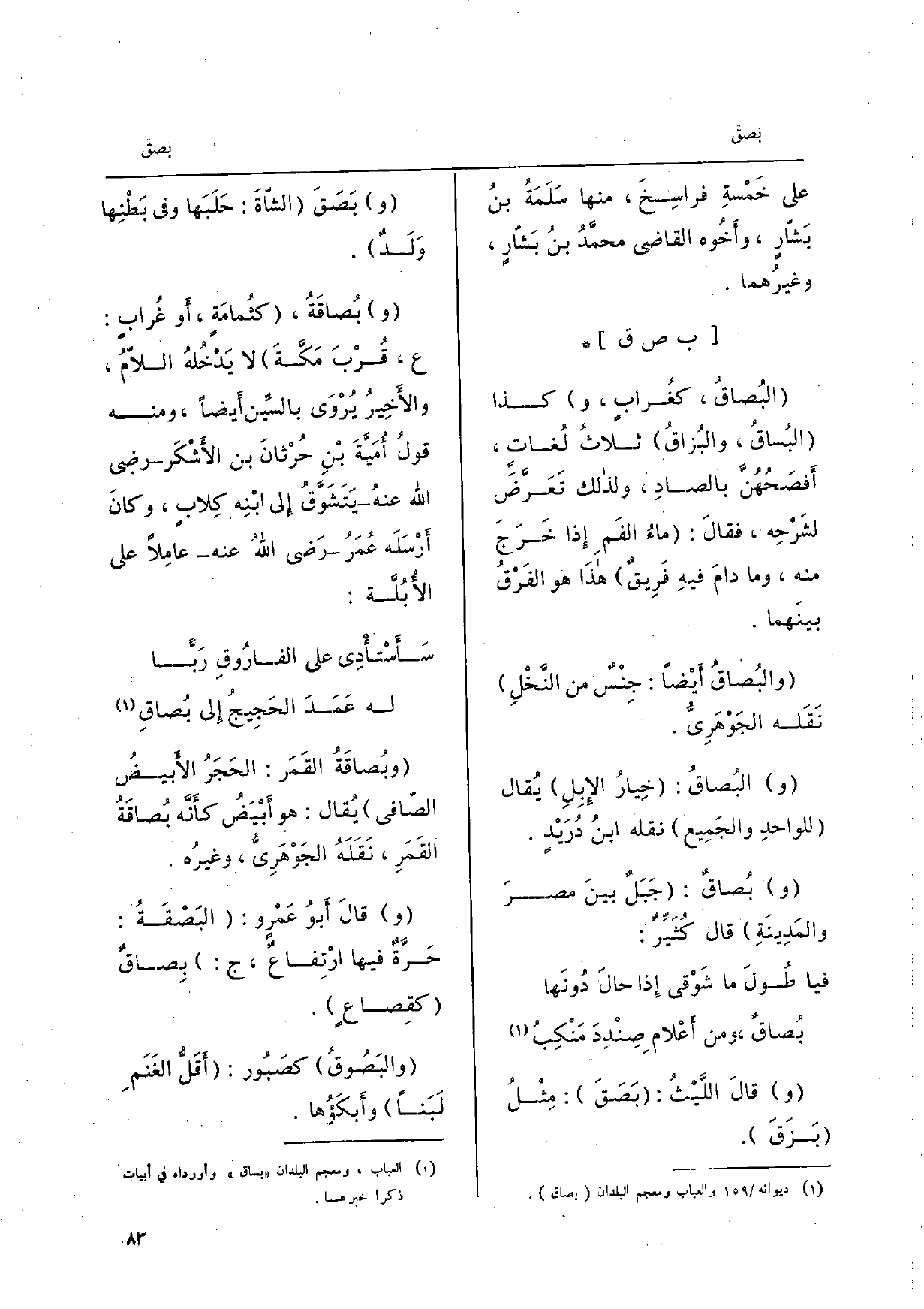 وقالَ اللَّيْثُ: بَصَقَ: مِثلُ بَزرْقَ. وبَصَقَ الشّاةَ: حَلَبَها وَفِي بَطْنِها وَلَدٌ. وبصاقَةُ، كثُمامَةٍ، أَو غُرابٍ: ع، قُرْبَ مَكَّةَ لَا يَدْخُلهُ اللاّمُ، والأَخِيرُ يُرْوَي بالسِّين أَيضاً، وَمِنْه قَول أمَيَّةَ بْنِ حُرْثانَ بن الأَشْكَر رَضِي الله عنهُ يَتَشَوَّقُ إِلى ابْنِه كِلابٍ، وكانَ أَرْسَلَه عُمَرُ رَضي اللهُ عَنهُ عامِلاً على الأُبُلة: