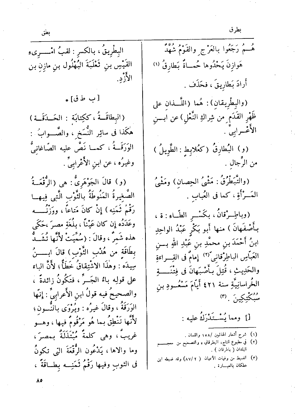 أَرادَ بَطارِيقَ، فحَذَف. والبِطْرِيقانِ: هما اللَّذانِ على ظهْرِ القَدَمِمن شراكِ النعْلِ عَن ابنِ الأَعْرابِي. والبطارِقُ كعُلابِطٍ: الطَّويلُ من الرَجالِ. والتبرُق: مَشْي الحِصانِ ومَشي المَرْأَةِ، كَمَا فِي العُبابِ. وباطِرْقانُ، بكَسْرِ الطّاءِ: ة، بأَصْفهانَ مِنْهَا أَبو بَكْرٍ عَبْد الواحِد ابنُ أَحْمَدَ بنِ محمَّدِ بنِ عَبْدِ الله بنِ العَباس الباطِرْقانِيّ إِمامٌ فِي القِراءَة والحَدِيثِ، قُتِلَ بأَصْبَهان فِي فِتنَة الخراسانِيَّةِ سنة، أَياّمَ مَسْعودِ بنِ سبكتكِين.