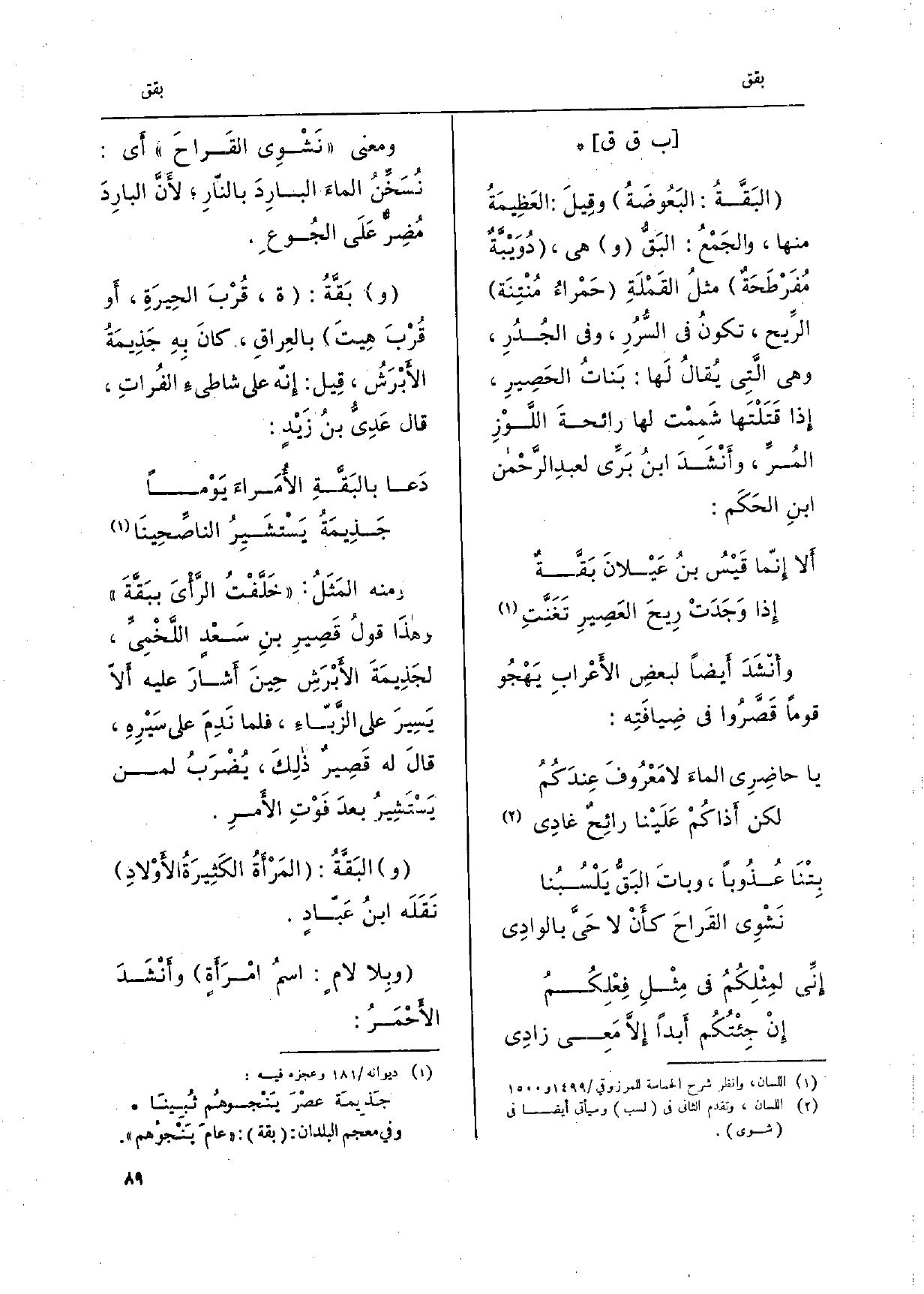وَمعنى نَشْوِى القراح أَي: نُسَخِّنُ الماءَ البارِدَ بالناّرِ، لأَنَّ البارِدَ مُضِرٌّ عَلَى الجُوعَ. (و) {بَقَّة: ة، قُرْبَ الحِيرَةِ، أَو قُرْبَ هِيتَ بالعِراقِ، كانَ بِهِ جَذيمة الأَبْرَش، قِيل: إِنه على شاطئ الفُراتِ، قَالَ عَدِىُّ بن زَيْدٍ: