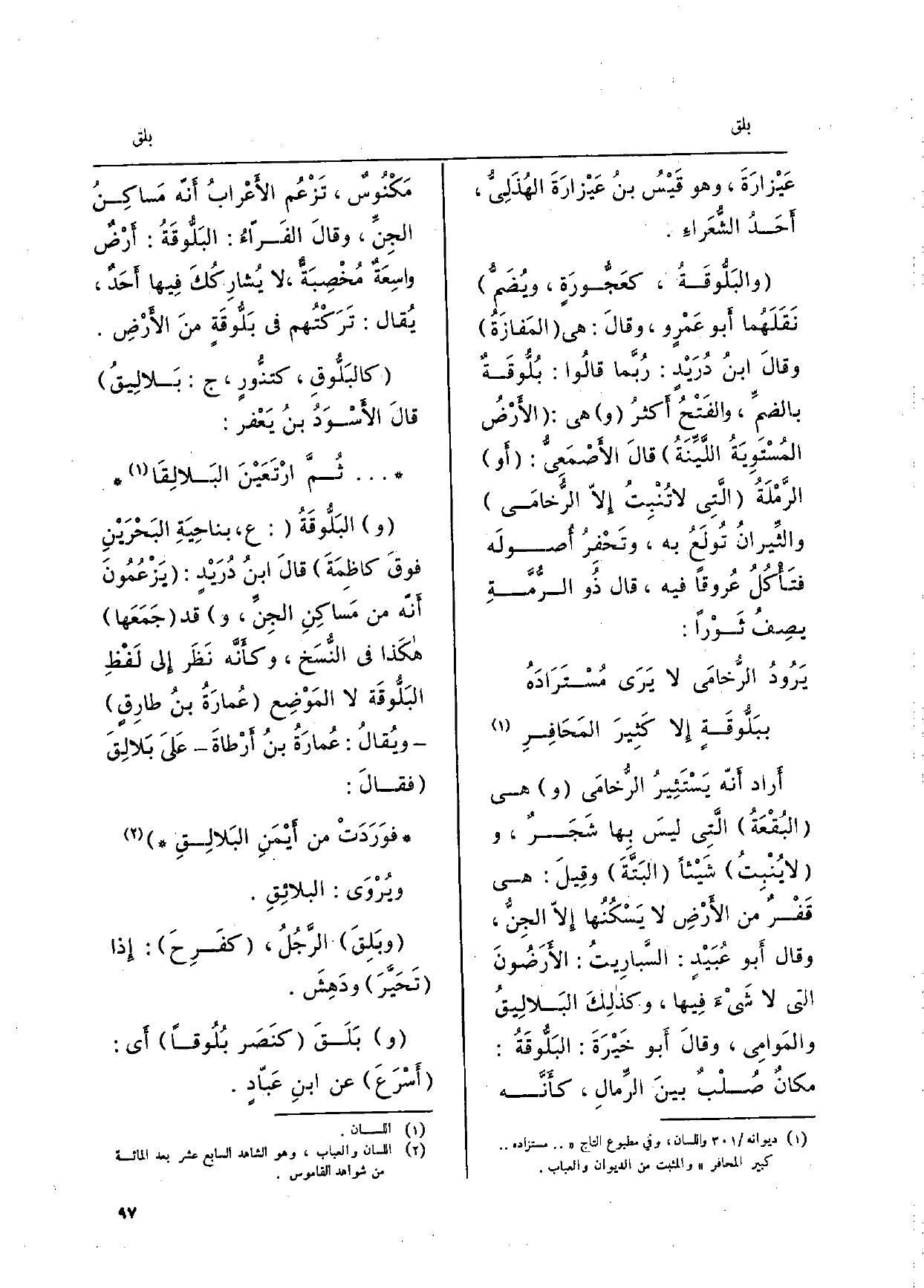 من الأَرْضِ لَا يَسْكُنُها إِلاّ الجِنّ، وَقَالَ أَبو عُبَيْدٍ: السَّبارِيتُ: الأَرَضُونَ الَّتِي لَا شَيْء فِيها، وكذلِكَ البَلالِيقُ والمَوامِي، وقالَ أَبو خَيرَةَ: البَلُّوقَةُ: مكانٌ صُلْب بينَ الرِّمالِ، كأَنَّه مَكْنُوسٌ، تَزْعُم الأعْرابُ أَنه مَساكِنُ الجِنِّ، وقالَ الفرّاءُ: البَلُّوقَةُ: أَرْضٌ واسِعَةٌ مُخْصِبَة، لَا يُشارِكُكَ فِيها أَحَدٌ، يُقال: ترَكْتهم فِي بَلوقَةٍ منَ الأَرْضَ. كالبَلُّوق، كتنورٍ، ج: بَلالِيقُ قالَ الْأسود بنُ جَعْفَر: ... ثمَّ ارْتعَينَ البَلالِقَا والبَلوقَةُ: ع، بناحِيَةِ البَحْرَيْنِ فَوق كاظمَةَ قالَ ابنُ دُرَيدٍ: يَزْعُمُونَ أَنه من مَساكِنِ الجِنِّ، وَقد جَمَعَها. هكَذا فِي النُّسَخ، وكأَنَّه نَظَر إِلى لَفظِ البَلُّوقَة لَا المَوْضِع عُمارَةُ بنُ طارِقٍ ويُقالُ: عُمارَةُ بنُ أَرْطاةَ عَلىَ بَلالِقَ فقالَ: فوَرَدَتْ من أَيْمَنِ البَلالِقِ ويُرْوَى: البلائِقِ. وبلِقَ الرَّجُلُ، كفرح: إِذا تَحَيرَ ودَهِشَ. وبلَقَ كنَصَر بُلُوقاً أَي: أَسْرَعَ عَن ابْن عَباّدِ.