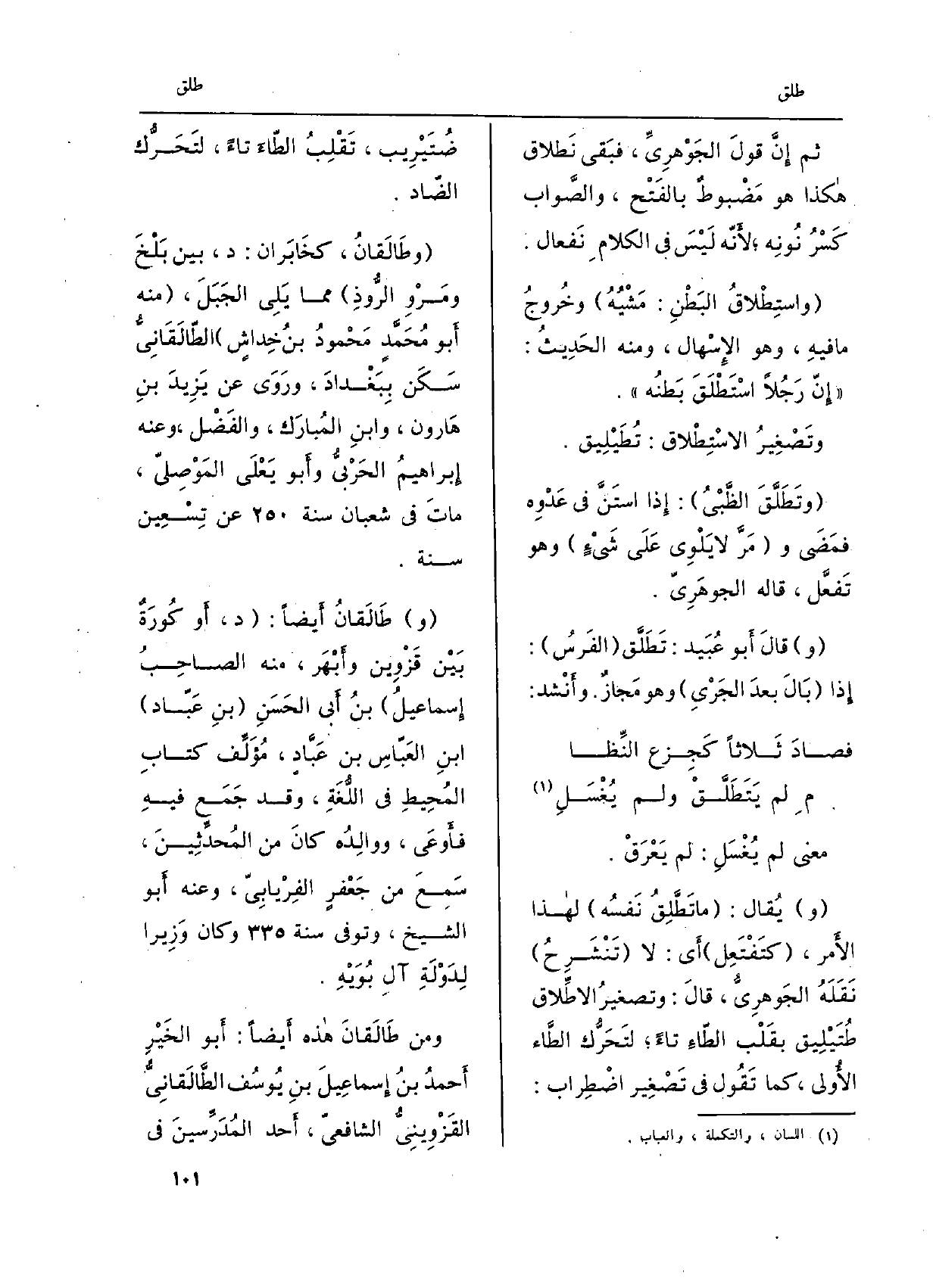 معنى لم يُغْسَلِ: لم يَعْرَقْ. ويُقال: مَا تطَّلِقُ نفسُه لهَذَا الْأَمر، كتَفْتَعِل أَي: لَا تنشَرِحُ نقَلَه الجوهريّ، قَالَ: وتصغيرُ الاطِّلاق طُتَيْلِيق بقَلْب الطّاءِ تَاء لتَحرُّك الطّاء الأولى، كَمَا تَقول فِي تَصْغير اضْطِراب: ضُتَيْرِيب، تَقلِبُ الطّاءَ تَاء، لتحَرُّك الضّاد. وطالَقانُ، كخابَران: د، بَين بَلْخَ ومَرْو الرّوذِ مِمَّا يَلي الجبَل، مِنْهُ أَبُو محمّدٍ محْمودُ بنُ خِداشٍ الطّالَقانيُّ سكَن ببغْدادَ، ورَوى عَن يَزيدَ بنِ هَارُون، وابنِ المُبارَك، والفَضْل، وَعنهُ إبراهيمُ الحَرْبيُّ وَأَبُو يَعْلَى المَوْصِليّ، ماتَ فِي شعْبَان سنة عَن تِسعِين سنة. وطالَقانُ أَيْضا: د، أَو كُورَةٌ بَين قَزْوين وأبْهَر، مِنْهُ الصاحِبُ إسماعيلُ بنُ أبي الحسَن بنِ عبّاد بنِ العبّاس بن عبّاد، مؤلِّف كتابِ المُحيطِ فِي اللّغة، وَقد جمَع فِيهِ فأوعَى، ووالدُه كَانَ من المُحدِّثين، سمِعَ من جَعْفَرٍ الفِرْيابيّ، وَعنهُ أَبُو الشَّيْخ، وَتُوفِّي سنة وَكَانَ وَزيراً لدَولَة آلِ بوَيْه. وَمن طالَقانَ هَذِه أَيْضا: أَبُو الخَيْر أحمدُ بنُ إسماعيلَ بنِ يوسُف الطّالَقانيّ القَزْوينيّ الشافعيّ، أحد المدرّسينَ فِي