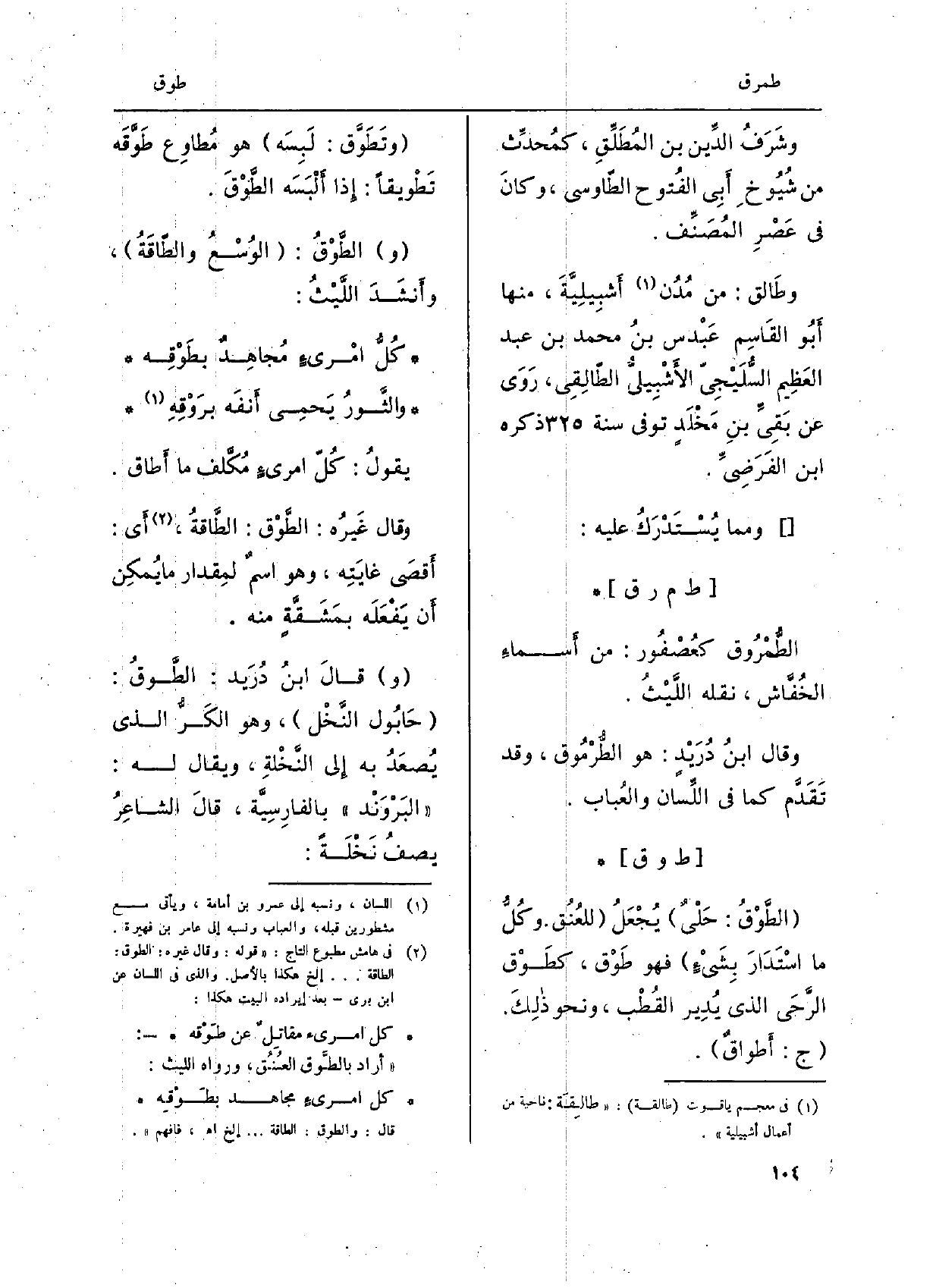 {الطَّوْق: حَلْيٌ يُجعَلُ للعُنُق. وكُلّ مَا اسْتَدارَ بشيءٍ فَهُوَ} طَوْق، {كطَوْق الرَّحَى الَّذِي يُدير القُطْب، وَنَحْو ذلِك. ج: أطْواقٌ.} وتطوَّق: لبِسَه هُوَ مُطاوِع {طوّقَه} تطْويقاً: إِذا ألْبَسَه {الطّوْقَ. والطّوْقُ: الوُسْعُ} والطّاقَةُ، وأنشَدَ اللّيْثُ: كُلُّ امْرئٍ مُجاهِدٍ {بطَوْقِه والثّورُ يحمِي أنفَه برَوْقِهِ يَقُول: كُلّ امرئٍ مكلّف مَا} أطَاق. وَقَالَ غيرُه: الطَّوْق:! الطّاقةُ، أَي: أقصَى غايَتِه، وَهُوَ اسمٌ لمِقْدار مَا يُمكِن أَن يفْعَلَه بمَشقّةٍ مِنْهُ. وَقَالَ ابنُ دُريد: الطَّوقُ: حابول النّخْل، وَهُوَ الكَرُّ الَّذِي يُصعَدُ بِهِ الى النّخْلَة، وَيُقَال لَهُ: البَرْوَنْد بالفارسيّة، قَالَ الشاعِر يصفُ نخْلَة: