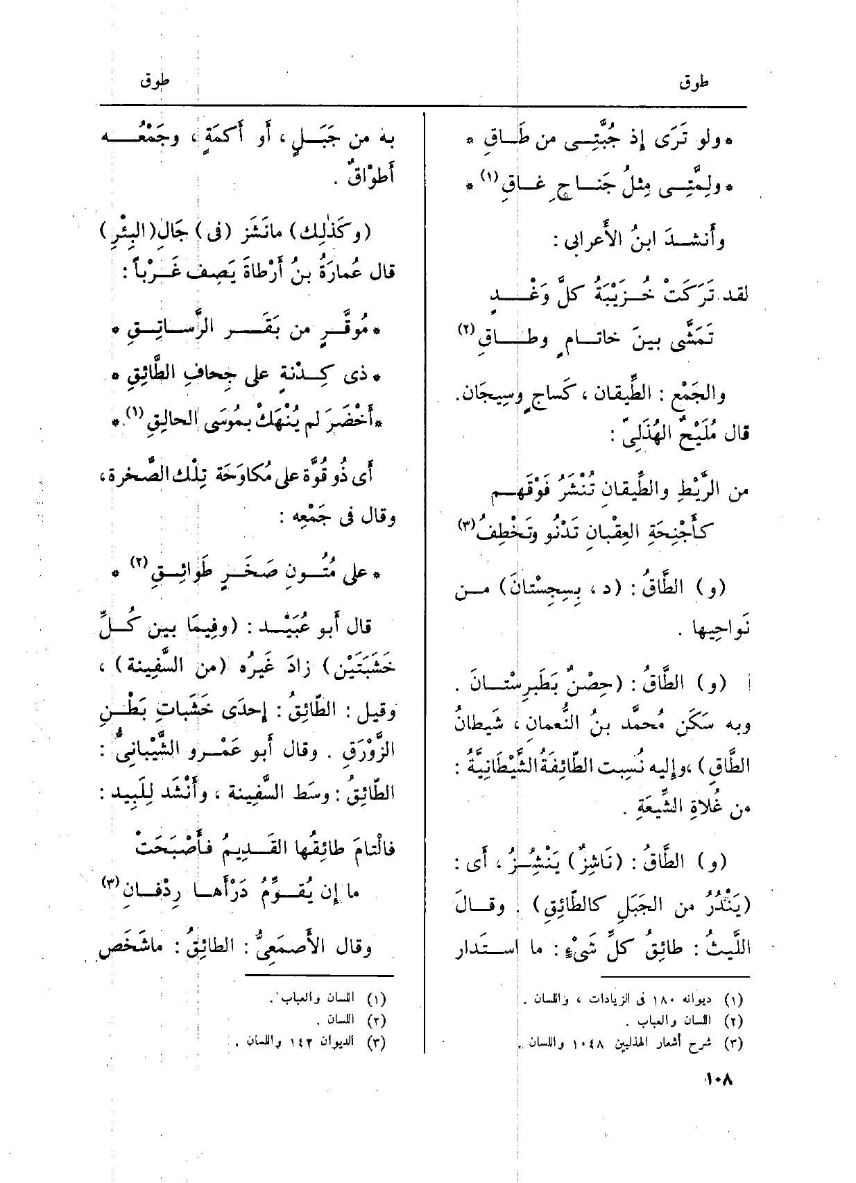 } أطْواقٌ. وكذلِك مَا نشَزَ فِي جالِ البِئْر قَالَ عُمارَةُ بنُ أرْطاةَ يصِف غرْباً: موقَّرٍ من بقَر الرّساتِقِ ذِي كِدْنةٍ على جِحافِ {الطّائِقِ أخْضَرَ لم يُنْهَكْ بموسَى الحالِقِ أَي ذُو قوّة على مُكاوَحَة تِلْك الصّخرة، وَقَالَ فِي جمْعِهِ: على مُتونِ صخَرٍ} طوائِقِ قَالَ أَبُو عُبَيد: وَفِيمَا بَين كُلِّ خشَبَتيْن زادَ غيرُه من السّفينة، وَقيل: {الطّائِقُ: إِحْدَى خشَباتِ بطْنِ الزّوْرَق. وَقَالَ أَبُو عمْرو الشّيْبانيّ: الطّائقُ: وسَط السّفينة، وأنشَد للَبيد: