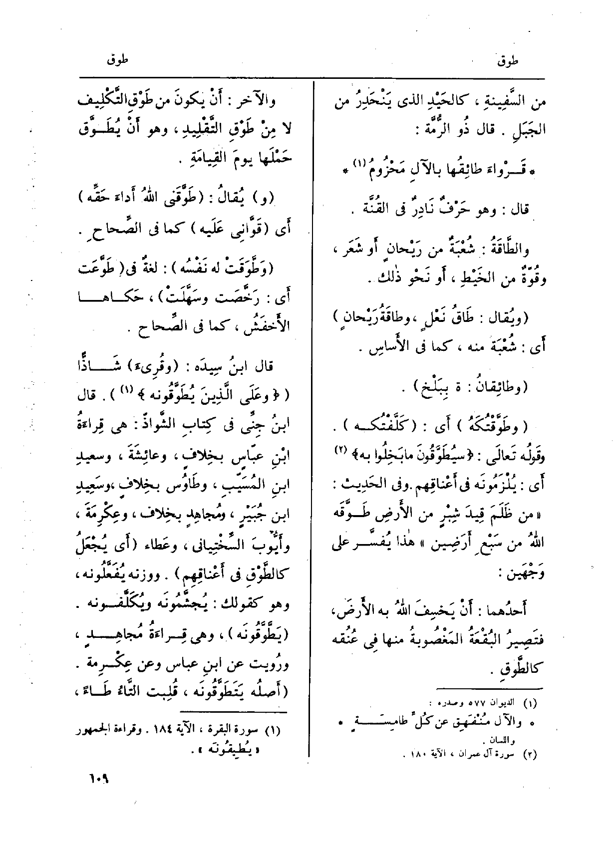 } وطوّقْتُكَهُ أَي: كلّفْتُكه. وقولُه تَعَالَى:) {سيطوَّقونَ مَا بخِلوا بِهِ (أَي: يُلْزِمونَه فِي أعْناقِهم. وَفِي الحَدِيث: من ظلَم قِيدَ شِبْرٍ من الأرضِ} طوّقَه اللهُ من سَبْعِ أرَضِين هَذَا يُفسَّر على وجْهَين: أحدُهما: أَن يخسِفَ اللهُ بِهِ الأرضَ، فتَصيرُ البُقعَةُ المَغصوبةُ مِنْهَا فِي عُنُقه {كالطّوقِ. وَالْآخر: أنْ يكونَ من} طَوْقِ التّكْليفِ لَا مِنْ طوْقِ التّقْليدِ، وَهُوَ أَن {يُطَوَّق حمْلَها يومَ القِيامةِ. ويُقال:} طوَّقَني اللهُ أداءَ حقِّه أَي قوّاني علَيه كَمَا فِي الصِّحاح. {وطوّقَتْ لَهُ نفْسُه: لغةٌ فِي طوّعَتْ أَي: رخّصَت وسهّلَتْ، حَكاها الأخفَشُ، كَمَا فِي الصِّحاح. قَالَ ابنُ سيدَه: وقُرِئَ شاذّاً) وعلَى الّذينَ} يُطوّقونَه (. قَالَ ابنُ جِنّي فِي كِتابِ الشّواذّ: هِيَ قِراءَةُ ابنِ عبّاس بخِلافٍ، وعائِشَةَ، وسعيدِ بنِ المُسَيّبِ، وطاوُس بخِلافٍ، وسَعيد بنِ جُبَيْر، ومُجاهِد بخِلاف، وعِكرِمةَ، وأيّوبَ السِّخْتِياني، وعَطاء أَي يُجْعَلُ {كالطّوْقِ فِي أعْناقِهم. ووزنه يفَعِّلونَه، وَهُوَ كَقَوْلِك: يُجشَّمونَه ويُكلَّفونَه.} يَطَّوَّقونَه، وَهِي قِراءَةُ مُجاهِدٍ، ورُويت عَن ابنِ عبّاس وَعَن عِكرِمة. أصلُه! يتطوَّقونَه، قُلِبت التّاءُ طاءً،