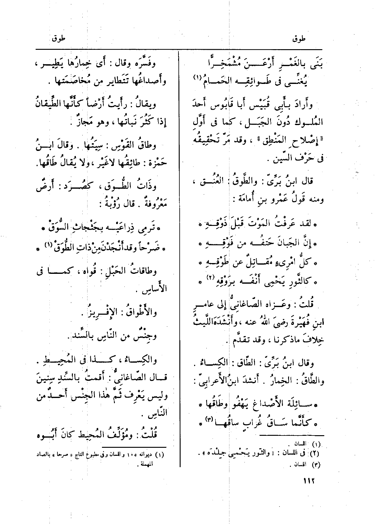 وأرادَ بِأبي قُبَيْس أَبَا قابُوس أحدَ المُلوك دونَ الجبَل، كَمَا فِي أوّلِ إصْلاحِ المنْطِق، وَقد مرّ تحْقِيقُه فِي حرْفِ السّين. قَالَ ابنُ بَرّي:} والطَّوقُ: العُنُق، وَمِنْه قولُ عَمْرو بنِ أُمامة: لقد عرَفْتُ الموتَ قبْلَ ذوْقِهِ إنّ الجَبانَ حتفُه من فوقِهِ كلُّ امرئٍ مُقاتلٌ عَن {طوْقِهِ كالثّورِ يحْمي أنفَه برَوْقِهِ قلت: وعَزاه الصّاغانيّ الى عامِرِ بنِ فُهَيْرةَ رَضِي اللهُ عَنهُ، وأنشَدَه اللّيثُ خِلافَ مَا ذكرنَا، وَقد تقدّم. وَقَالَ ابنُ بَرّي:} الطّاق: الكِساءُ. {والطّاقُ: الخِمار. أنشدَ ابنُ الْأَعرَابِي: سائِلَة الأصْداغ يهْفو} وطاقُها كأنّما ساقُ غُرابٍ ساقُها وفسّرَه وَقَالَ: أَي خِمارُها يَطير، وأصداغُها تتطاير من مُخاصَمَتها. ويُقال: رأيتُ أرْضاً كأنّها {الطِيقانُ إِذا كثُرَ نباتُها، وَهُوَ مَجازٌ.} وطاقُ القَوْسِ: سيَتُها. وَقَالَ ابنُ حمْزة: {طائِقُها لَا غَيْر، وَلَا يُقالُ} طاقُها. وذاتُ {الطُّوَق، كصُرَد: أرضٌ معْروفَةٌ. قَالَ رؤبَةُ: تَرمِي ذِراعَيْه بجَثْجاثِ السُّوَقْ ضَرْحاً وَقد أنْجَدْنَ من ذاتِ} الطُّوَقْ {وطاقاتُ الحَبْلِ: قُواه، كَمَا فِي الأساس.} والأطواقُ: الإفْريزُ. وجِنْسٌ من النّاسِ بالسِّند. والكِساءُ، كَذَا فِي المُحيط. قَالَ الصّاغانيّ: أقمتُ بالسِّنْدِ سِنينَ وَلَيْسَ يعْرِف ثَمَّ هَذَا الجِنْس أحدٌ من النّاسِ.