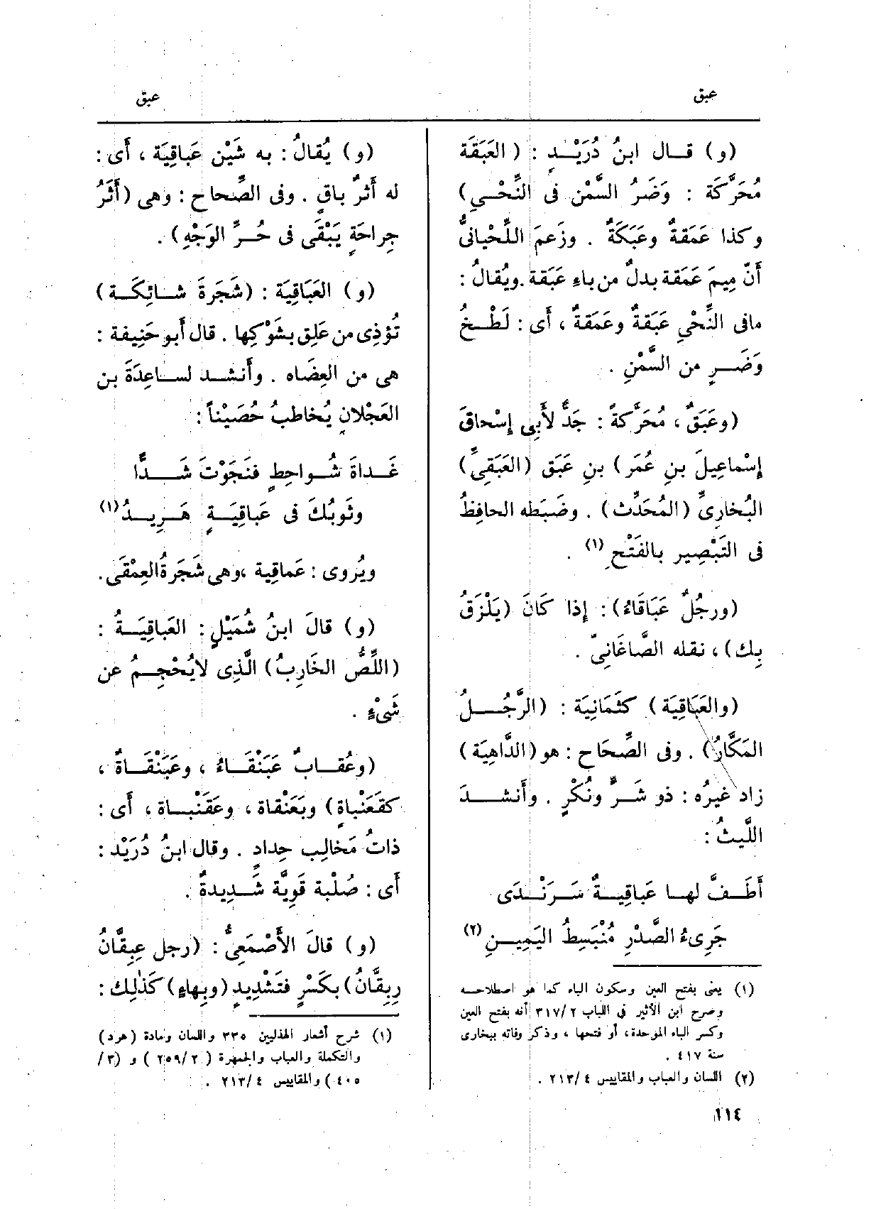 ويُروى: عَماقِية، وَهِي شَجَرةُ العِمْقَى. وقالَ ابنُ شُمَيْلٍ: العَباقِيَةُ: اللّصُّ الخارِبُ الّذي لَا يُحْجِمُ عَن شَيْء. وعُقابٌ عَبَنْقاءُ، وعَبَنْقاةٌ، كقَعَنْباةٍ وبَعَنْقاة، وعقَنْباة، أَي: ذاتُ مَخالِب حِدادٍ. وَقَالَ ابنُ دُرَيْد: أَي: صُلبة قويّة شَديدةٌ. وَقَالَ الأصمعيّ: رجل عِبِقّانُ رِبِقّانُ بكَسْر فتشْديد وبِهاءٍ كَذَلِك: