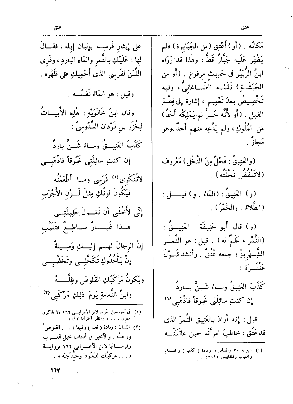 قيل: إِنَّه أرادَ بالعَتيق التّمرَ الَّذِي قد عتُق، خاطبَ امرأتَه حِين عاتَبَتْه على إيثارِ فرسِه بإلبان إبِله، فقالَ لَهَا: علَيْكِ بالتّمرِ والماءِ البارِد، وذَرِي اللّبَنَ لفَرسي الَّذِي أحْميكِ على ظهْره. وَقيل: هُوَ الماءُ نفسُه. وَقَالَ ابنُ خالَوَيْه: هذِه الأبياتُ لخُزَز بنِ لَوْذان السَّدوسيّ: