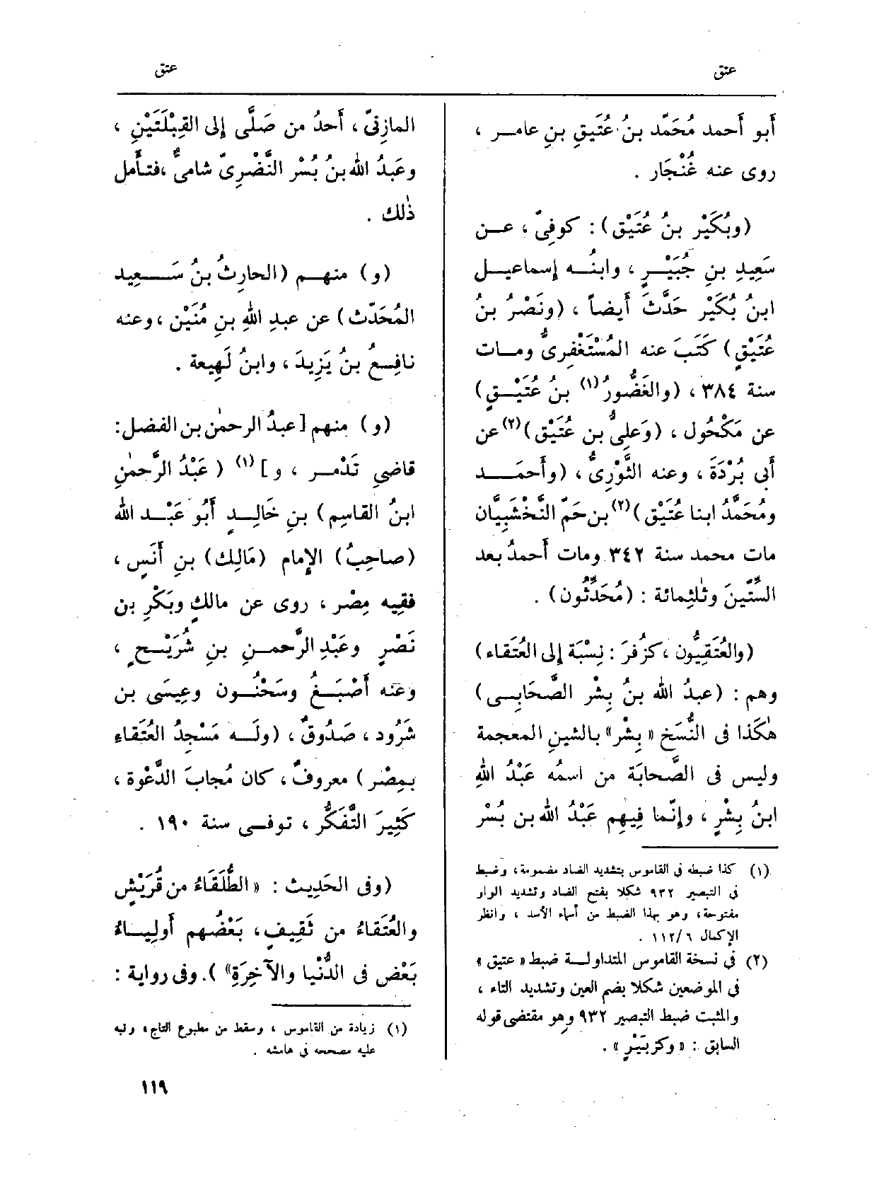 وبُكَيْر بنُ عُتَيق: كوفيّ، عَن سَعيدِ بنِ جُبَيْرٍ، وابنُه إِسْمَاعِيل بنُ بُكَيْر حدَّثَ أَيْضا، ونَصْرُ بنُ عُتَيْقٍ كتَبَ عَنهُ المُستَغْفِريّ وَمَات سنة، والغضّورُ بنُ عُتَيْقٍ عَن مَكْحول، وعليُّ بن عُتَيق عَن أبي بفرْدَةَ، وَعنهُ الثّوْريّ، وأحمَد ومحمّدُ ابْنا عُتَيق بن حَمّ النّخْشَبِيّان مَاتَ مُحَمَّد سنة وَمَات أحمدُ بعد السّتين وثلثِمائة: مُحدِّثون. والعُتَقيّون، كزُفر: نِسبَة الى العُتَقاء وهم: عبدُ الله بنُ بِشْر الصّحابي هكَذا فِي النُسَخ بِشْر بالشينِ الْمُعْجَمَة وَلَيْسَ فِي الصَّحابَة من اسمُه عبْدُ اللهِ بنُ بِشْرٍ، وإنّما فيهِم عبدُ الله بن بُسْر المازِنيّ، أحدُ من صَلّى الى القِبْلَتَيْن، وعبدُ الله بنُ بُسْر النّضْريّ شاميٌّ، فَتَأمل ذَلِك. وَمِنْهُم الحارثُ بنُ سَعيد المُحَدّث عَن عبدِ اللهِ بنِ مُنَيْن، وَعنهُ نافِعُ بنُ يَزيدَ، وابنُ لَهِيعة. وَمِنْهُم عبدُ الرَّحْمَن ب الْفضل: قَاضِي تدْمُر، وعبدُ الرّحمنِ بنُ القاسِم بنِ خالدٍ أَبُو عبْد الله صاحبُ الإِمَام مالِك بنِ أنَس، فَقِيه مِصْر، روى عَن مالكٍ وبكْرِ بن نَصْرٍ وعبدِ الرّحمنِ بنِ شُرَيْح، وَعنهُ أصْبَغُ وسَحْنون وعيسَى بن شَرود، صَدوقٌ، ولَه مسْجِدُ العُتَقاءِ بمِصْر معروفٌ، كَانَ مُجابَ الدّعوة، كثيرَ التّفكُّر، توفّي سنة. وَفِي الحَدِيث: الطُلَقاءُ من قُرَيْش والعُتَقاءُ من ثَقيفٍ، بعضُهم أولِياءُ بعْض فِي الدُنْيا والآخِرَة. وَفِي رِوَايَة: