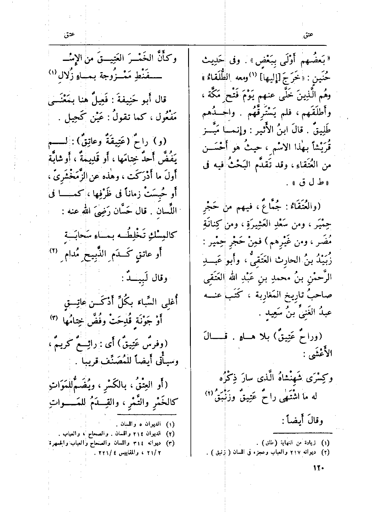 بعضُهم أوْلَى ببَعْضٍ. وَفِي حَديث حُنَين: خرَج إِلَيْهَا وَمَعَهُ الطُلَقاءُ وهُم الَّذين خلّى عَنْهُم يومَ فتْحِ مكّة، وأطلَقَهم، فَلم يسْتَرِقَّهُم. واحدُهم طَليقٌ. قَالَ ابنُ الْأَثِير: وَإِنَّمَا ميّز قُرَيْشاً بِهَذَا الاسمِ، حَيْثُ هُوَ أحسَن من العُتَقاءِ، وَقد تقدّم البَحْثُ فِيهِ فِي ط ل ق. والعُتَقاءُ: جُمّاعٌ، فيهم من حَجْرِ حِمْيَر، وَمن سَعْدِ العَشيرَةِ، وَمن كِنانَةِ مُضَر، وَمن غيرِهم فمِنْ حَجْرِ حِمْيَر: زُبَيْدُ بنُ الحارِث العتَقيُّ، وَأَبُو عبدِ الرّحْمنِ بنُ محمدِ بنِ عبْدِ الله العَتَقي صاحبُ تَارِيخ المَغارِبة، كتب عَنهُ عبدُ الغَنيّ بنُ سَعيد. وراحٌ عَتيقٌ بِلَا هاءٍ. قَالَ الأعْشى: