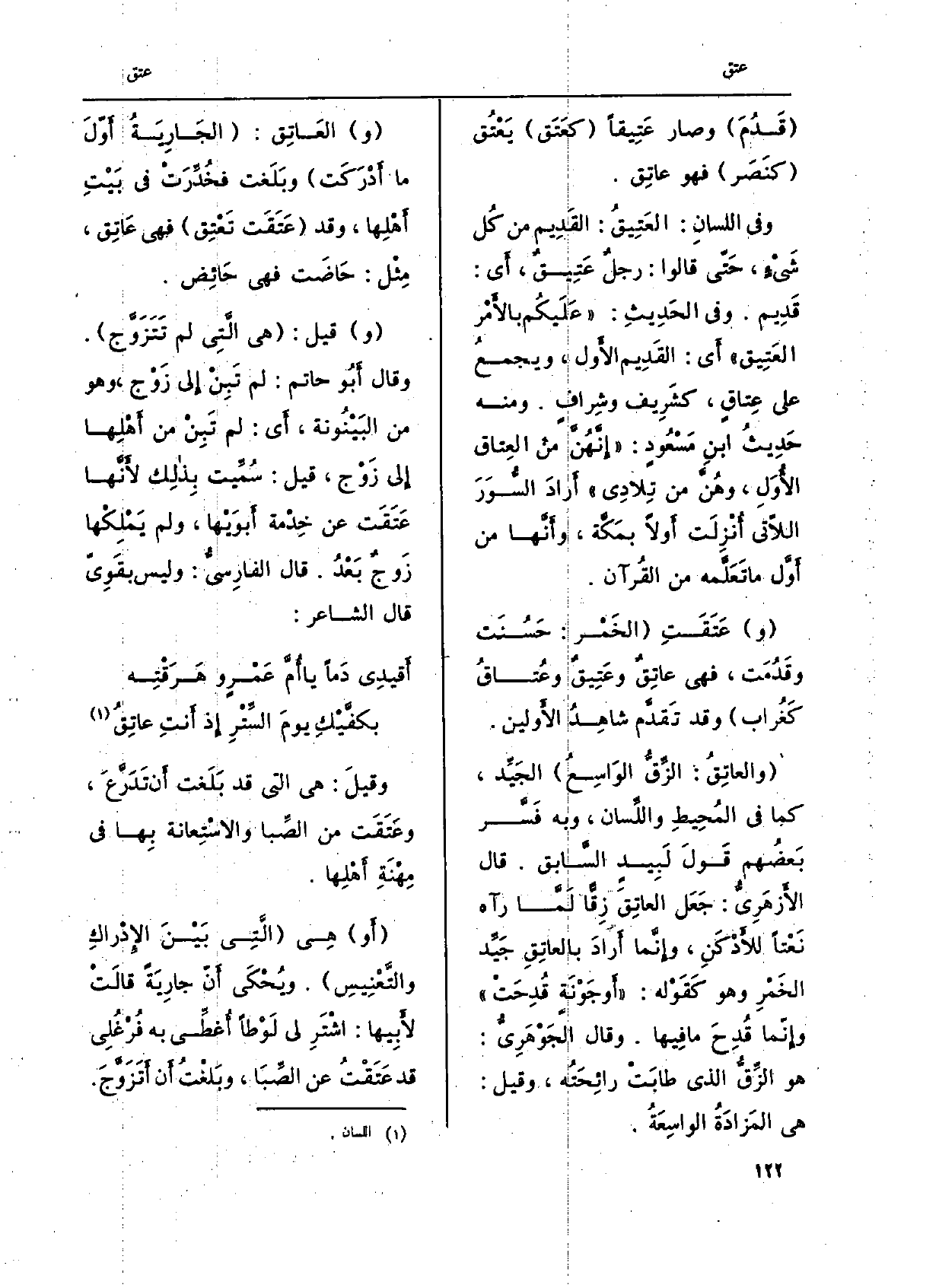 قَدُمَ وَصَارَ عَتيقاً كعتَق يعْتُق كنَصَر فَهُوَ عاتِق. وَفِي اللسانِ: العَتيقُ: القَديم من كُل شيْءٍ، حتّى قَالُوا: رجُلٌ عَتيقٌ، أَي: قَديم. وَفِي الحَديث: عليكُم بالأمْر العَتيق أَي: القَديم الأول، ويجمعُ على عِتاقٍ، كشَريف وشِرافٍ. وَمِنْه حديثُ ابنِ مسْعود: إنّهُنّ من العِتاق الأُوَل، وهُنّ من تِلادِي أرادَ السُّوَرَ اللاّتي أُنزِلَت أَولا بمكّة، وأنّها من أوّل مَا تعلّمه من القُرآن. وعَتَقَتِ الخمْر: حسُنَت وقدُمَت، فَهِيَ عاتِقٌ وعَتيقٌ وعُتاقُ كغُراب وَقد تقدّم شاهِدُ الْأَوَّلين. والعاتِقُ: الزِّقّ الواسِعُ الجيِّد، كَمَا فِي المُحيطِ واللّسان، وَبِه فسّر بعضُهم قولَ لَبيد السّابق. قَالَ الأزهَريُّ: جعَل العاتِقَ زِقّاً لمّا رَآهُ نعْتاً للأدْكَنِ، وإنّما أرادَ بالعاتِقِ جيِّد الخَمْرِ وَهُوَ كقَوْله: أَو جَوْنَةٍ قُدِحَت)