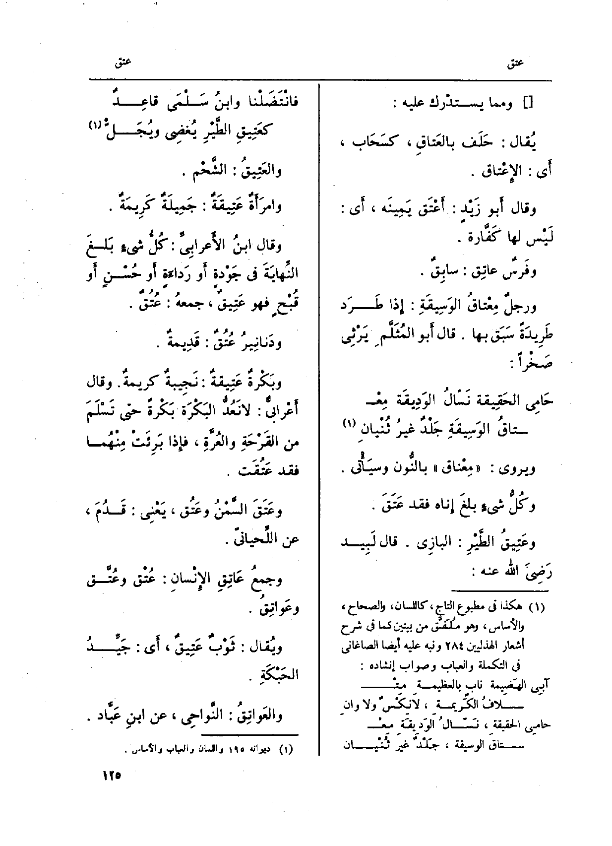 والعَتيقُ: الشّحْم. وَامْرَأَة عَتيقَةٌ: جميلَةٌ كَريمَةٌ. وَقَالَ ابنُ الأعرابيّ: كُلّ شيءٍ بلغَ النّهايةَ فِي جَوْدَةٍ أَو رَداءَةٍ أَو حُسْنٍ أَو قُبْحٍ فَهُوَ عَتيقٌ، جمعهُ: عُتُقٌ. ودَنانيرُ عُتُقٌ: قَديمةٌ. وبَكْرةٌ عَتيقةٌ: نَجيبةٌ كريمةٌ. وَقَالَ أعْرابيٌّ: لَا نَعُدُّ البَكْرَة بكْرةً حَتَّى تسْلَمَ من القَرْحَة والعُرَّة ث، فَإِذا برِئَتْ منْهُما فقد عتُقَت. وعتَقَ السّمْن وعَتُق، يعْني: قدُم، عَن اللِّحْياني. وجمعُ عاتِقِ الإنْسانِ: عُتْق وعُتَّق وعَواتِق. ويُقال: ثوبٌ عَتيق، أَي: جيِّدُ الحَبْكَةِ. والعَواتِقُ: النّواحي، عَن ابنِ عبّاد.)